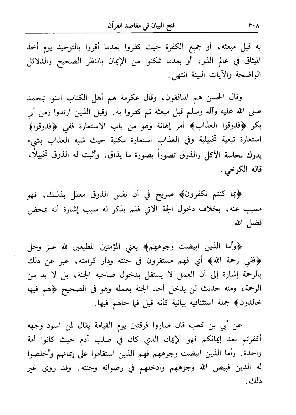 وقال الحسن هم المنافقون، وقال عكرمة هم أهل الكتاب آمنوا بمحمد صلى الله عليه وآله وسلم قبل مبعثه ثم كفروا به. وقيل الذين ارتدوا زمن أبي بكر (فذوقوا العذاب) أمر إهانة وهو من باب الاستعارة ففي (فذوقوا) استعارة تبعية تخييلية وفي العذاب استعارة مكنية حيث شبه العذاب بشيٍء يدرك بحاسة الأكل والذوق تصوراً بصورة ما يذاق، وأثبت له الذوق تخييلاً، قاله الكرخي.