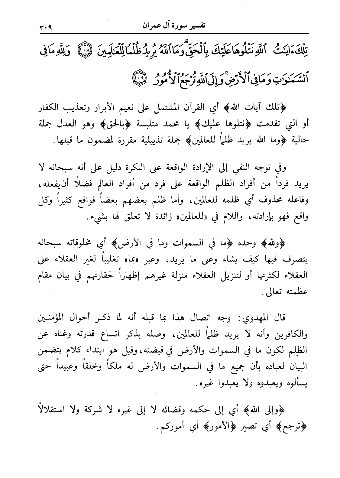 تِلْكَ آيَاتُ اللَّهِ نَتْلُوهَا عَلَيْكَ بِالْحَقِّ وَمَا اللَّهُ يُرِيدُ ظُلْمًا لِلْعَالَمِينَ (108) وَلِلَّهِ مَا فِي السَّمَاوَاتِ وَمَا فِي الْأَرْضِ وَإِلَى اللَّهِ تُرْجَعُ الْأُمُورُ (109)