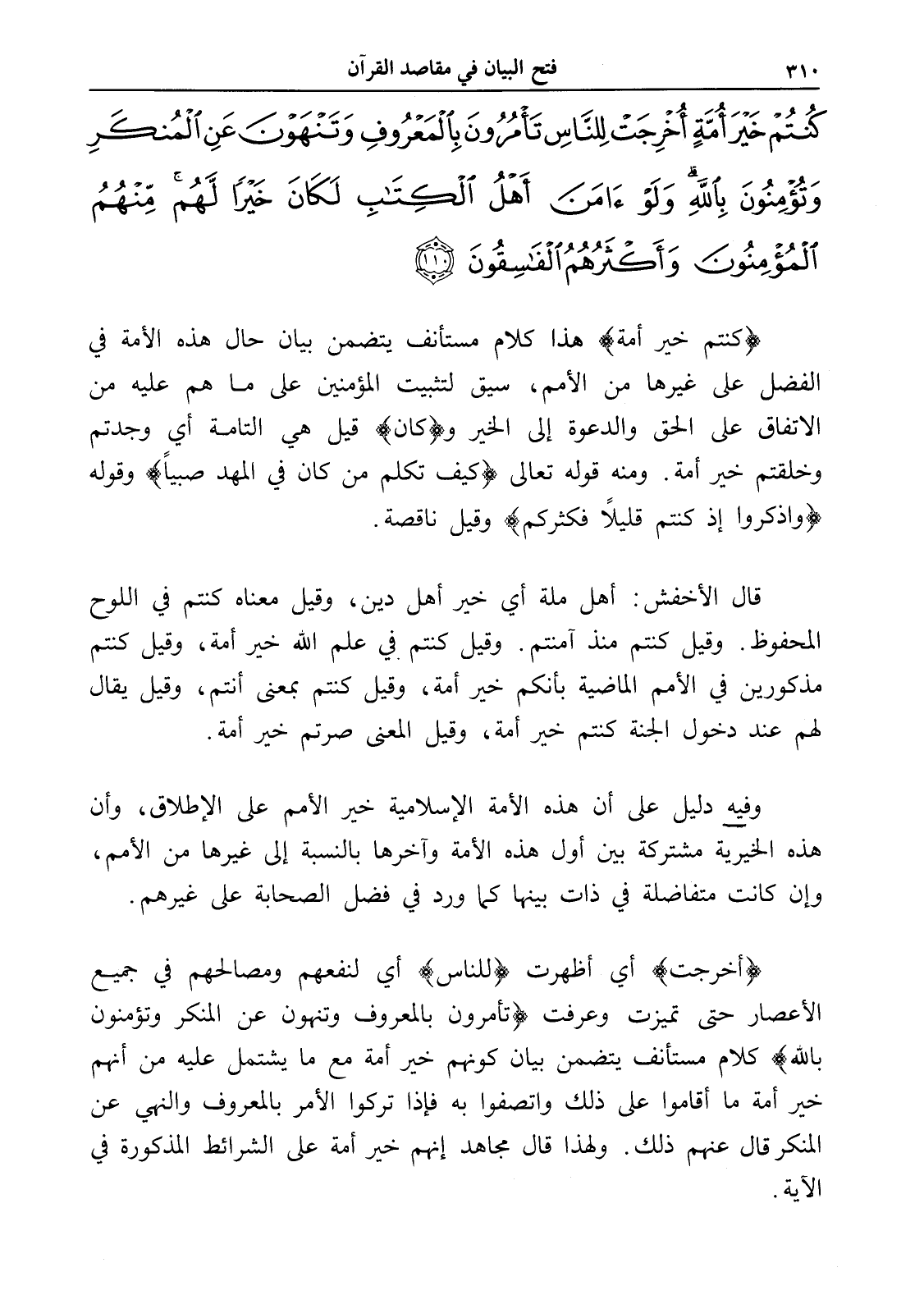 كُنْتُمْ خَيْرَ أُمَّةٍ أُخْرِجَتْ لِلنَّاسِ تَأْمُرُونَ بِالْمَعْرُوفِ وَتَنْهَوْنَ عَنِ الْمُنْكَرِ وَتُؤْمِنُونَ بِاللَّهِ وَلَوْ آمَنَ أَهْلُ الْكِتَابِ لَكَانَ خَيْرًا لَهُمْ مِنْهُمُ الْمُؤْمِنُونَ وَأَكْثَرُهُمُ الْفَاسِقُونَ (110)