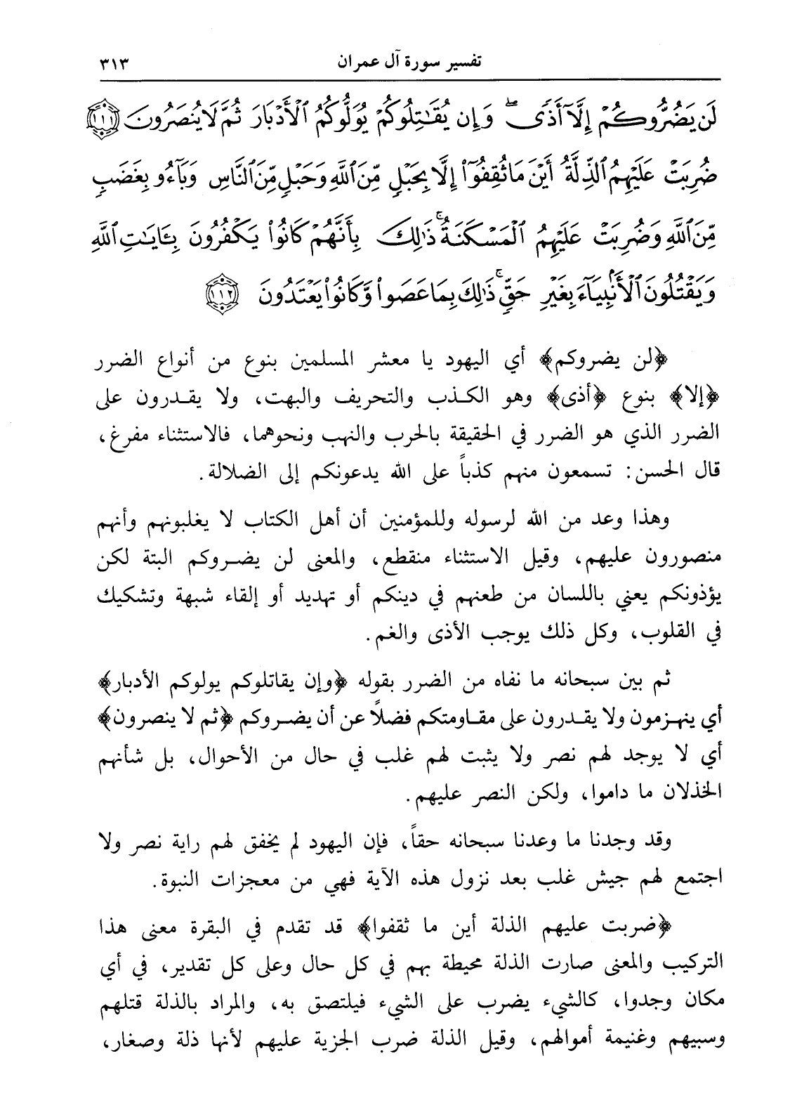 لَنْ يَضُرُّوكُمْ إِلَّا أَذًى وَإِنْ يُقَاتِلُوكُمْ يُوَلُّوكُمُ الْأَدْبَارَ ثُمَّ لَا يُنْصَرُونَ (111) ضُرِبَتْ عَلَيْهِمُ الذِّلَّةُ أَيْنَ مَا ثُقِفُوا إِلَّا بِحَبْلٍ مِنَ اللَّهِ وَحَبْلٍ مِنَ النَّاسِ وَبَاءُوا بِغَضَبٍ مِنَ اللَّهِ وَضُرِبَتْ عَلَيْهِمُ الْمَسْكَنَةُ ذَلِكَ بِأَنَّهُمْ كَانُوا يَكْفُرُونَ بِآيَاتِ اللَّهِ وَيَقْتُلُونَ الْأَنْبِيَاءَ بِغَيْرِ حَقٍّ ذَلِكَ بِمَا عَصَوْا وَكَانُوا يَعْتَدُونَ (112)