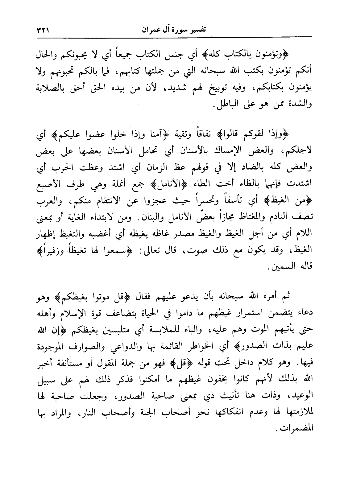 (وإذا لقوكم قالوا) نفاقاً وتقية (آمنا وإذا خلوا عضوا عليكم) أي لأجلكم، والعض الإمساك بالأسنان أي تحامل الأسنان بعضها على بعض والعض كله بالضاد إلا في قولهم عظ الزمان أي اشتد وعظت الحرب أي اشتدت فإنهما بالظاء أخت الطاء (الأنامل) جمع أنملة وهي طرف الأصبع (من الغيظ) أي تأسفاً وتحسراً حيث عجزوا عن الإنتقام منكم، والعرب تصف النادم والمغتاظ مجازاً بعضّ الأنامل والبنان. ومن لابتداء الغاية أو بمعنى اللام أي من أجل الغيظ والغيظ مصدر غاظه يغيظه أي أغضبه والتغيظ إظهار الغيظ، وقد يكون مع ذلك صوت، قال تعالى: (سمعوا لها تغيظاً وزفيراً) قاله السمين.