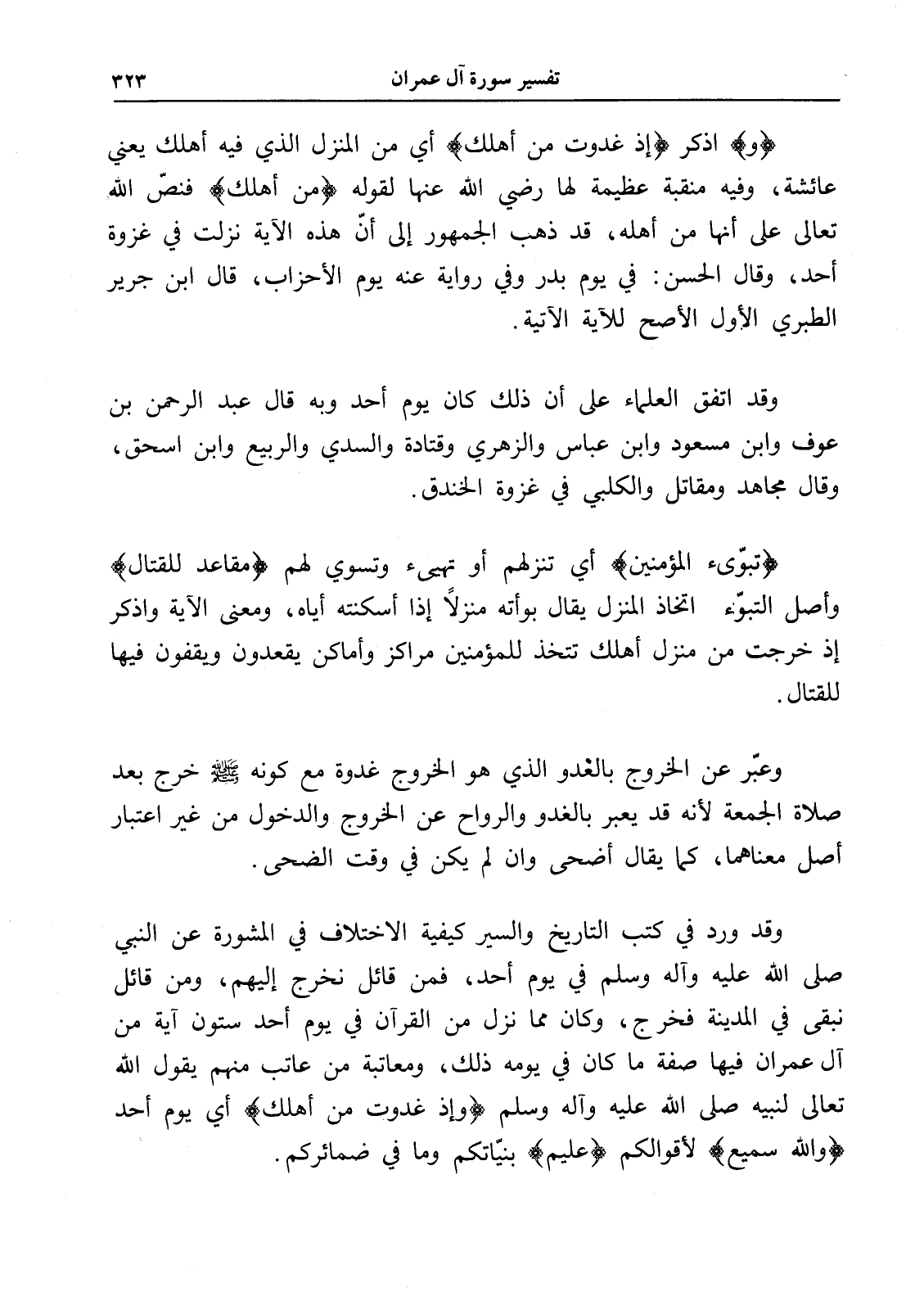 (و) اذكر (إذ غدوت من أهلك) أي من المنزل الذي فيه أهلك يعني عائشة، وفيه منقبة عظيمة لها رضي الله عنها لقوله (من أهلك) فنصّ الله تعالى على أنها من أهله، قد ذهب الجمهور إلى أنّ هذه الآية نزلت في غزوة أحد، وقالى الحسن: في يوم بدر وفي رواية عنه يوم الأحزاب، قالى ابن جرير الطبري الأول الأصح للآية الآتية.