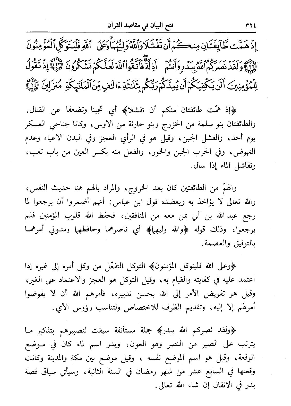 إِذْ هَمَّتْ طَائِفَتَانِ مِنْكُمْ أَنْ تَفْشَلَا وَاللَّهُ وَلِيُّهُمَا وَعَلَى اللَّهِ فَلْيَتَوَكَّلِ الْمُؤْمِنُونَ (122) وَلَقَدْ نَصَرَكُمُ اللَّهُ بِبَدْرٍ وَأَنْتُمْ أَذِلَّةٌ فَاتَّقُوا اللَّهَ لَعَلَّكُمْ تَشْكُرُونَ (123) إِذْ تَقُولُ لِلْمُؤْمِنِينَ أَلَنْ يَكْفِيَكُمْ أَنْ يُمِدَّكُمْ رَبُّكُمْ بِثَلَاثَةِ آلَافٍ مِنَ الْمَلَائِكَةِ مُنْزَلِينَ (124)