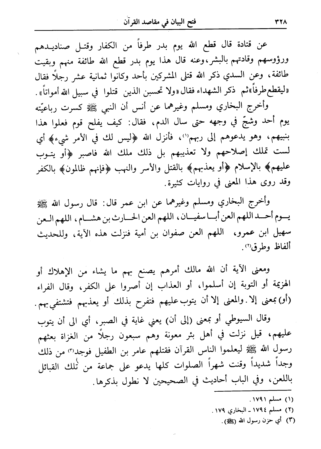 وأخرج البخاري ومسلم وغيرهما عن ابن عمر قال: قال رسول الله - صلى الله عليه وسلم - يوم أحد اللهم العن أبا سفيان، اللهم العن الحارث بن هشام، اللهم العن سهيل ابن عمرو، اللهم العن صفوان بن أمية فنزلت هذه الآية، وللحديث ألفاظ وطرق (¬1).
