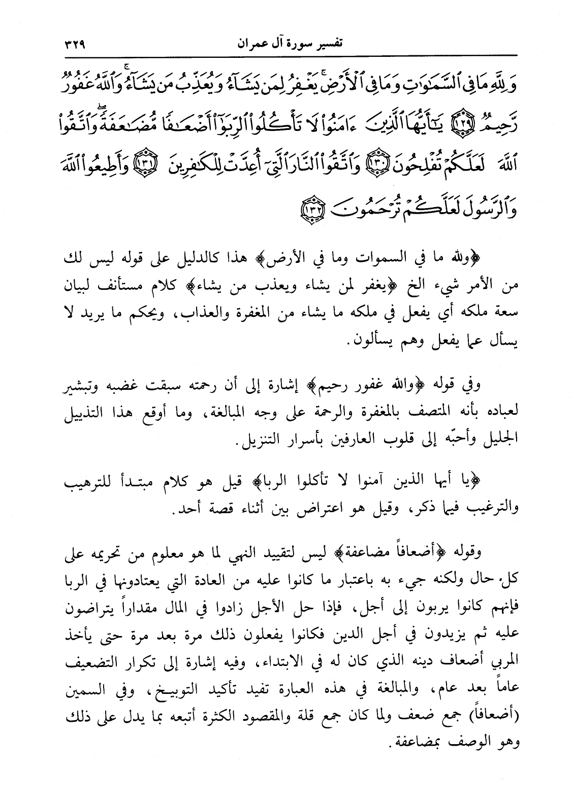 وَلِلَّهِ مَا فِي السَّمَاوَاتِ وَمَا فِي الْأَرْضِ يَغْفِرُ لِمَنْ يَشَاءُ وَيُعَذِّبُ مَنْ يَشَاءُ وَاللَّهُ غَفُورٌ رَحِيمٌ (129) يَا أَيُّهَا الَّذِينَ آمَنُوا لَا تَأْكُلُوا الرِّبَا أَضْعَافًا مُضَاعَفَةً وَاتَّقُوا اللَّهَ لَعَلَّكُمْ تُفْلِحُونَ (130) وَاتَّقُوا النَّارَ الَّتِي أُعِدَّتْ لِلْكَافِرِينَ (131) وَأَطِيعُوا اللَّهَ وَالرَّسُولَ لَعَلَّكُمْ تُرْحَمُونَ (132)