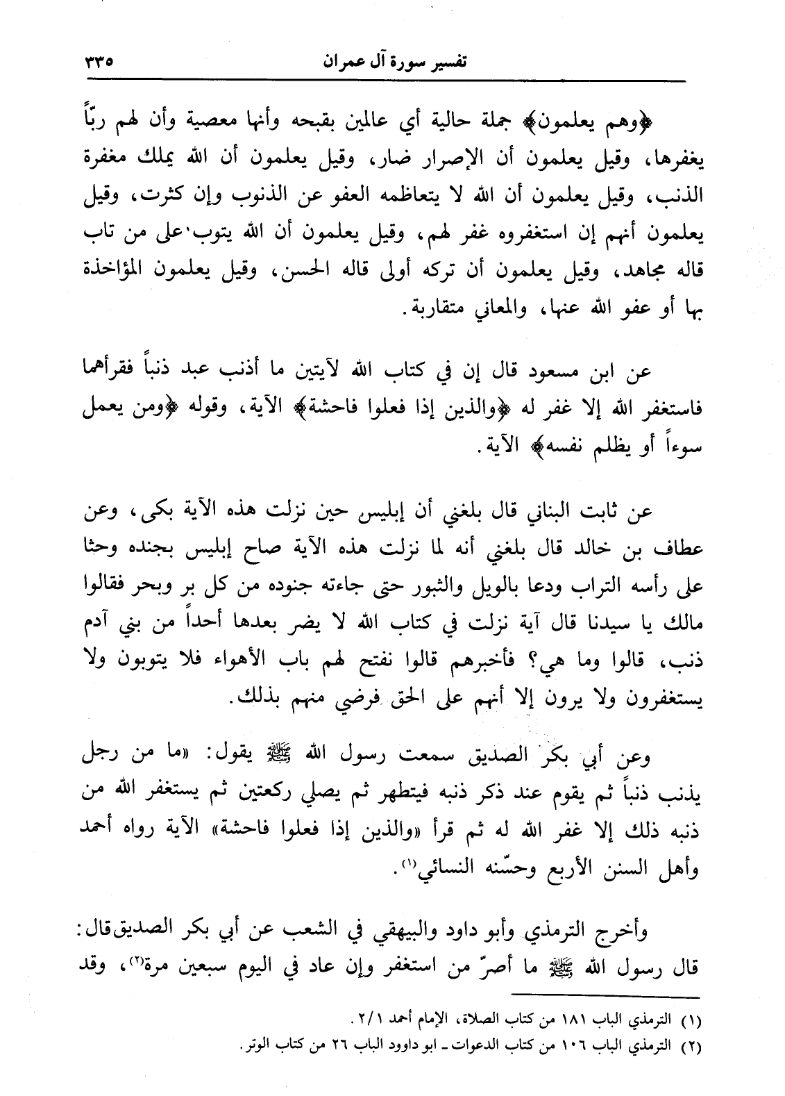 عن ابن مسعود قال إن في كتاب الله لآيتين ما أذنب عبد ذنباً فقرأهما فاستغفر الله إلا غفر له (والذين إذا فعلوا فاحشة) الآية، وقوله (ومن يعمل سوءاً أو يظلم نفسه) الآية.