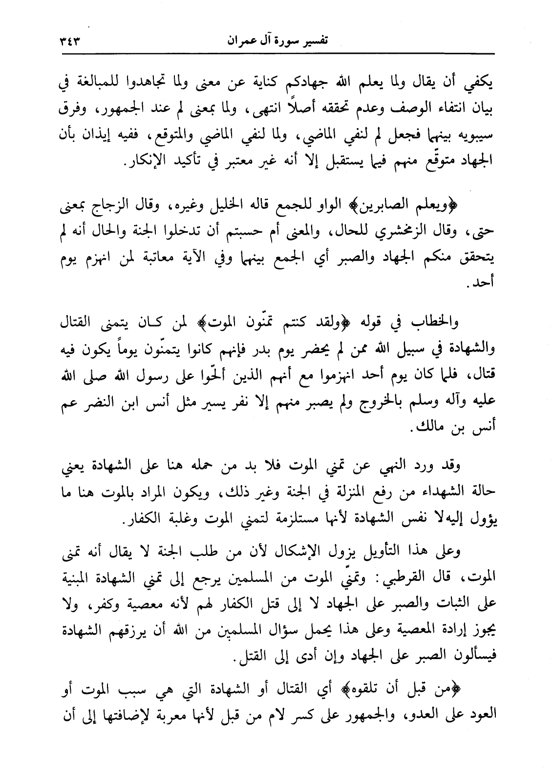 (ولقد كنتم تمنّون الموت) لمن كان يتمنى القتال والشهادة في سبيل الله ممن لم يحضر يوم بدر فإنهم كانوا يتمنّون يوماً يكون فيه قتال، فلما كان يوم أحد انهزموا مع أنهم الذين ألحّوا على رسول الله صلى الله عليه وآله وسلم بالخروج ولم يصبر منهم إلا نفر يسير مثل أنس ابن النضر عم أنس بن مالك.