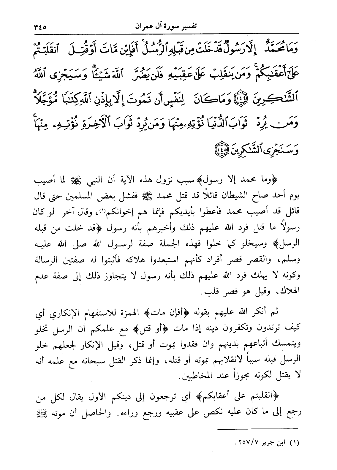 وَمَا مُحَمَّدٌ إِلَّا رَسُولٌ قَدْ خَلَتْ مِنْ قَبْلِهِ الرُّسُلُ أَفَإِنْ مَاتَ أَوْ قُتِلَ انْقَلَبْتُمْ عَلَى أَعْقَابِكُمْ وَمَنْ يَنْقَلِبْ عَلَى عَقِبَيْهِ فَلَنْ يَضُرَّ اللَّهَ شَيْئًا وَسَيَجْزِي اللَّهُ الشَّاكِرِينَ (144) وَمَا كَانَ لِنَفْسٍ أَنْ تَمُوتَ إِلَّا بِإِذْنِ اللَّهِ كِتَابًا مُؤَجَّلاً وَمَنْ يُرِدْ ثَوَابَ الدُّنْيَا نُؤْتِهِ مِنْهَا وَمَنْ يُرِدْ ثَوَابَ الْآَخِرَةِ نُؤْتِهِ مِنْهَا وَسَنَجْزِي الشَّاكِرِينَ (145)
