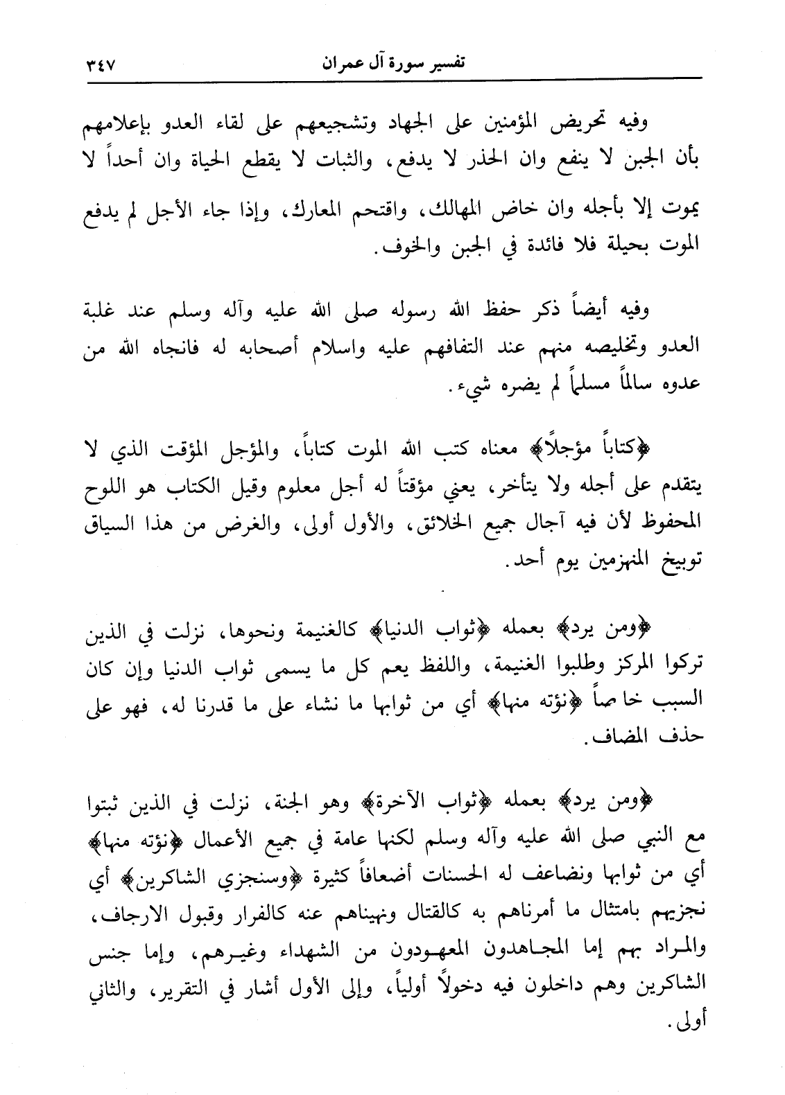 (كتاباً مؤجلاً) معناه كتب الله الموت كتاباً، والمؤجل المؤقت الذي لا يتقدم على أجله ولا يتأخر، يعني مؤقتاً له أجل معلوم وقيل الكتاب هو اللوح المحفوظ لأن فيه آجال جميع الخلائق، والأول أولى، والغرض من هذا السياق توبيخ المنهزمين يوم أحد.