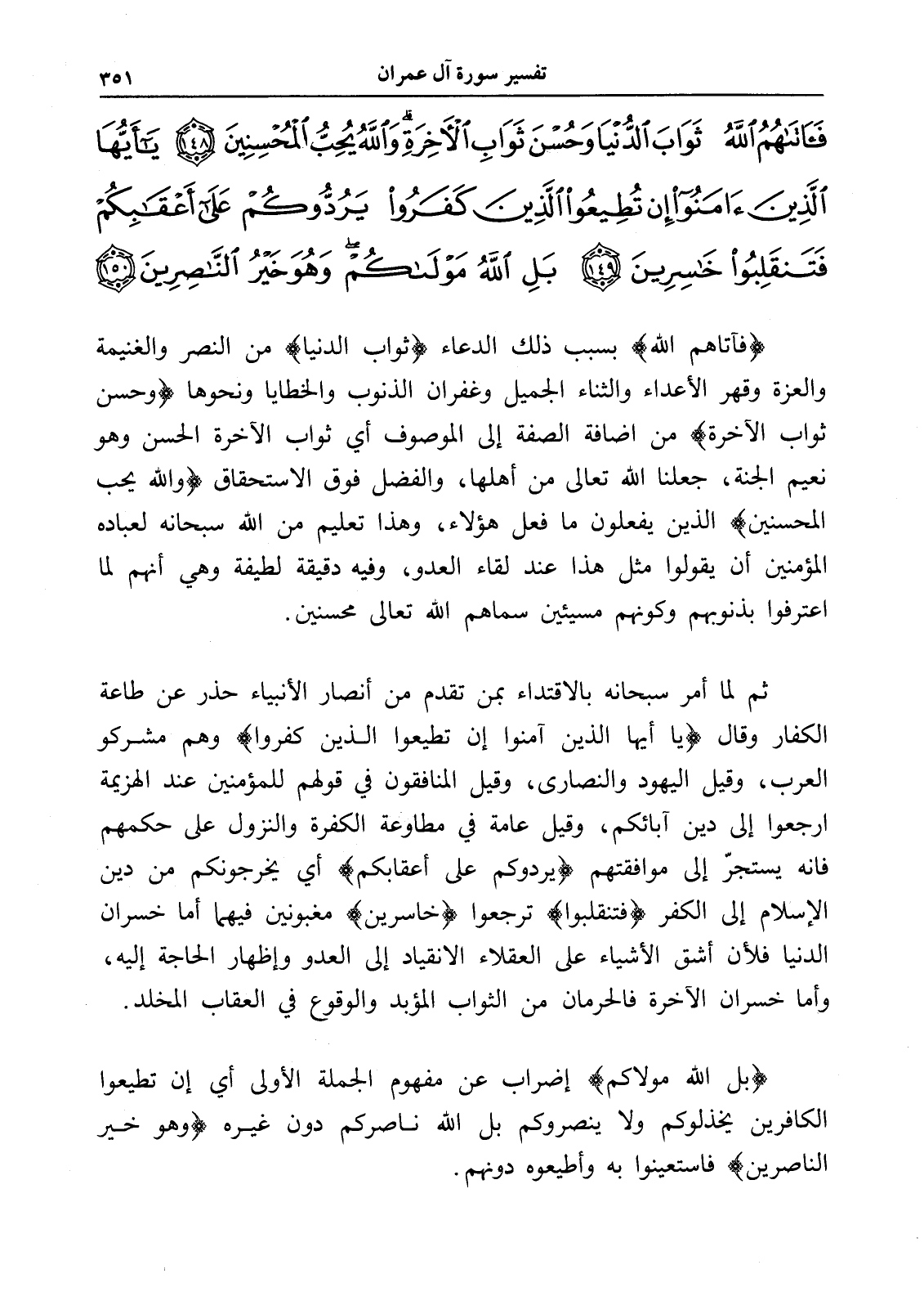 فَآَتَاهُمُ اللَّهُ ثَوَابَ الدُّنْيَا وَحُسْنَ ثَوَابِ الْآَخِرَةِ وَاللَّهُ يُحِبُّ الْمُحْسِنِينَ (148) يَا أَيُّهَا الَّذِينَ آَمَنُوا إِنْ تُطِيعُوا الَّذِينَ كَفَرُوا يَرُدُّوكُمْ عَلَى أَعْقَابِكُمْ فَتَنْقَلِبُوا خَاسِرِينَ (149) بَلِ اللَّهُ مَوْلَاكُمْ وَهُوَ خَيْرُ النَّاصِرِينَ (150)