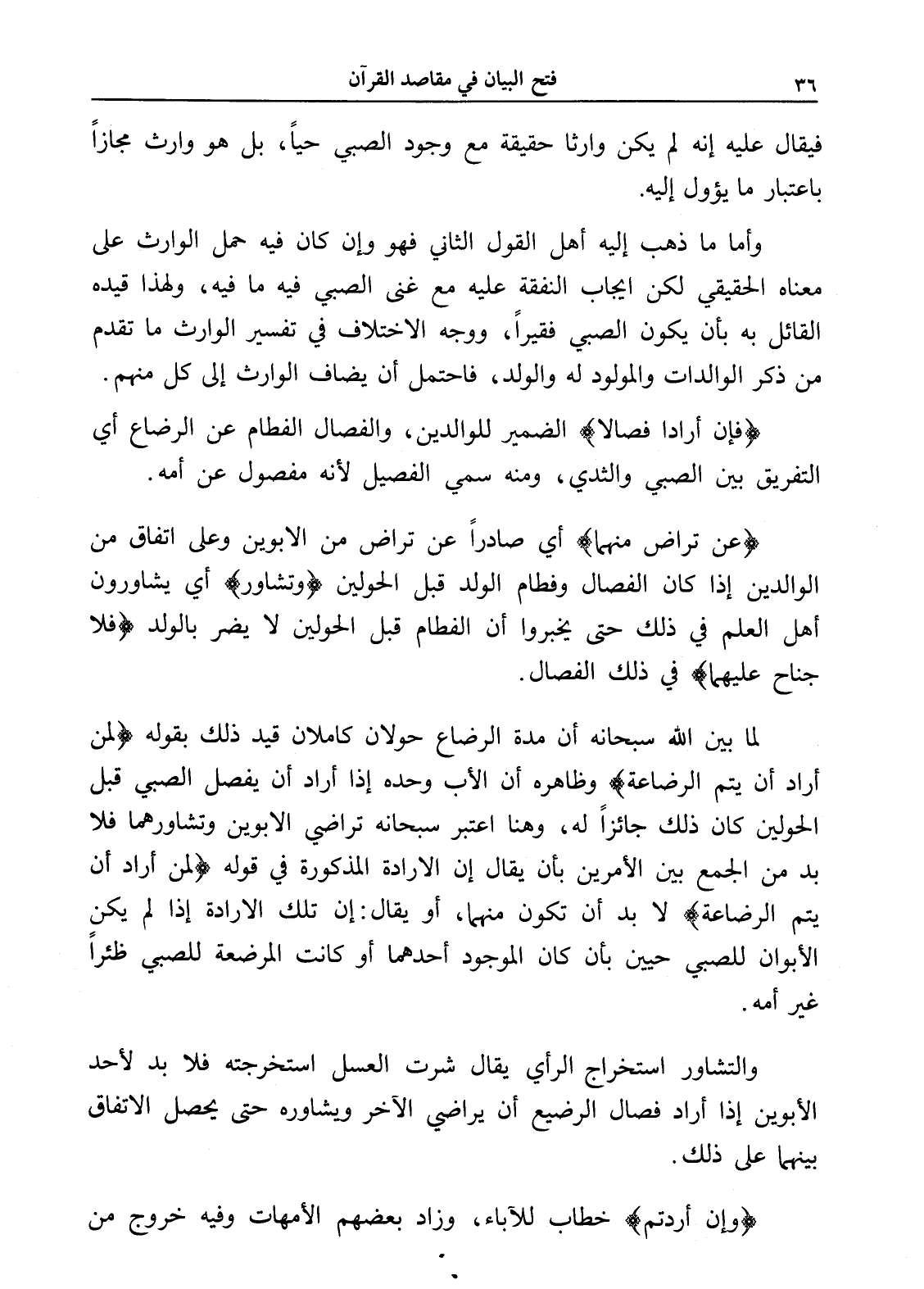 (فإن أرادا فصالاً) الضمير للوالدين، والفصال الفطام عن الرضاع أي التفريق بين الصبي والثدي، ومنه سمي الفصيل لأنه مفصول عن أمه.