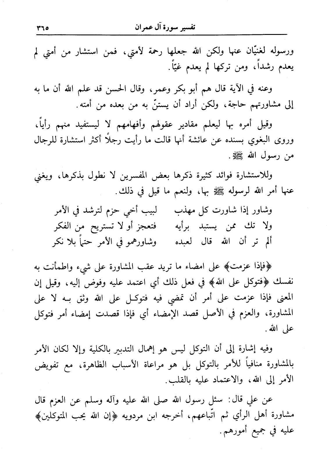 عن علي قال: سئل رسول الله صلى الله عليه وآله وسلم عن العزم قال مشاورة أهل الرأي ثم اتّباعهم، أخرجه ابن مردويه (إن الله يحب المتوكلين) عليه في جميع أمورهم.