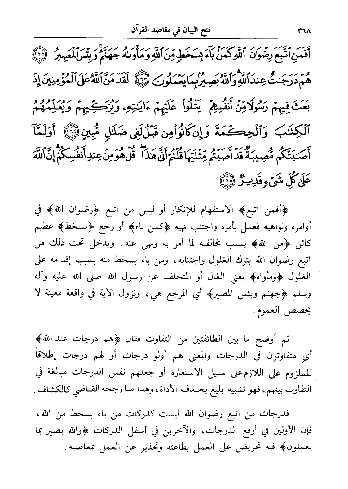 أَفَمَنِ اتَّبَعَ رِضْوَانَ اللَّهِ كَمَنْ بَاءَ بِسَخَطٍ مِنَ اللَّهِ وَمَأْوَاهُ جَهَنَّمُ وَبِئْسَ الْمَصِيرُ (162) هُمْ دَرَجَاتٌ عِنْدَ اللَّهِ وَاللَّهُ بَصِيرٌ بِمَا يَعْمَلُونَ (163) لَقَدْ مَنَّ اللَّهُ عَلَى الْمُؤْمِنِينَ إِذْ بَعَثَ فِيهِمْ رَسُولاً مِنْ أَنْفُسِهِمْ يَتْلُو عَلَيْهِمْ آَيَاتِهِ وَيُزَكِّيهِمْ وَيُعَلِّمُهُمُ الْكِتَابَ وَالْحِكْمَةَ وَإِنْ كَانُوا مِنْ قَبْلُ لَفِي ضَلَالٍ مُبِينٍ (164) أَوَلَمَّا أَصَابَتْكُمْ مُصِيبَةٌ قَدْ أَصَبْتُمْ مِثْلَيْهَا قُلْتُمْ أَنَّى هَذَا قُلْ هُوَ مِنْ عِنْدِ أَنْفُسِكُمْ إِنَّ اللَّهَ عَلَى كُلِّ شَيْءٍ قَدِيرٌ (165)