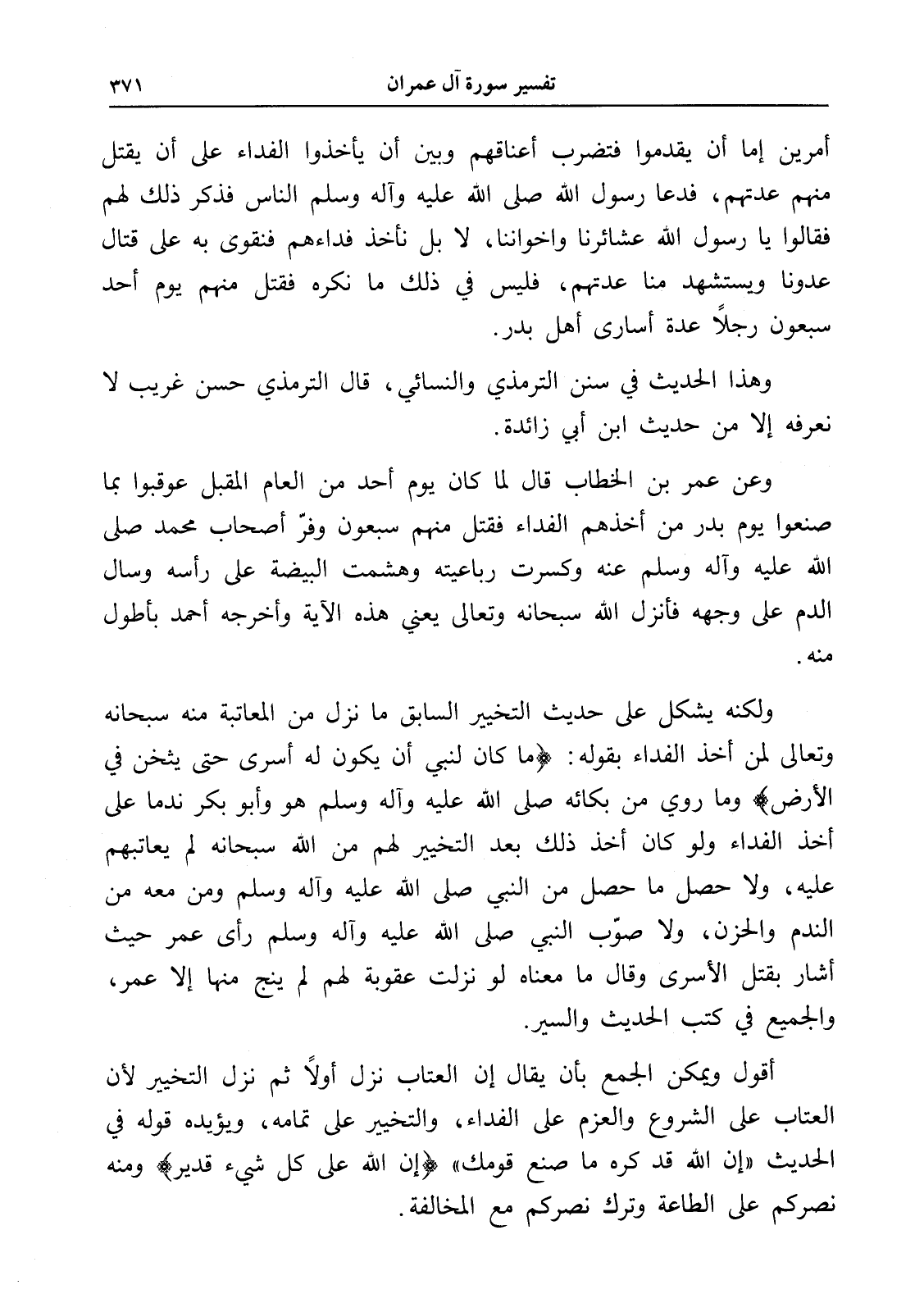 ولكنه يشكل على حديث التخيير السابق ما نزل من المعاتبة منه سبحانه وتعالى لمن أخذ الفداء بقوله: (ما كان لنبي أن يكون له أسرى حتى يثخن في الأرض) وما روي من بكائه صلى الله عليه وآله وسلم هو وأبو بكر ندماً على أخذ الفداء ولو كان أخذ ذلك بعد التخيير لهم من الله سبحانه لم يعاتبهم عليه، ولا حصل ما حصل من النبي صلى الله عليه وآله وسلم ومن معه من الندم والحزن، ولا صوّب النبي صلى الله عليه وآله وسلم رأى عمر حيث أشار بقتل الأسرى وقال ما معناه لو نزلت عقوبة لهم لم ينج منها إلا عمر، والجميع في كتب الحديث والسير.