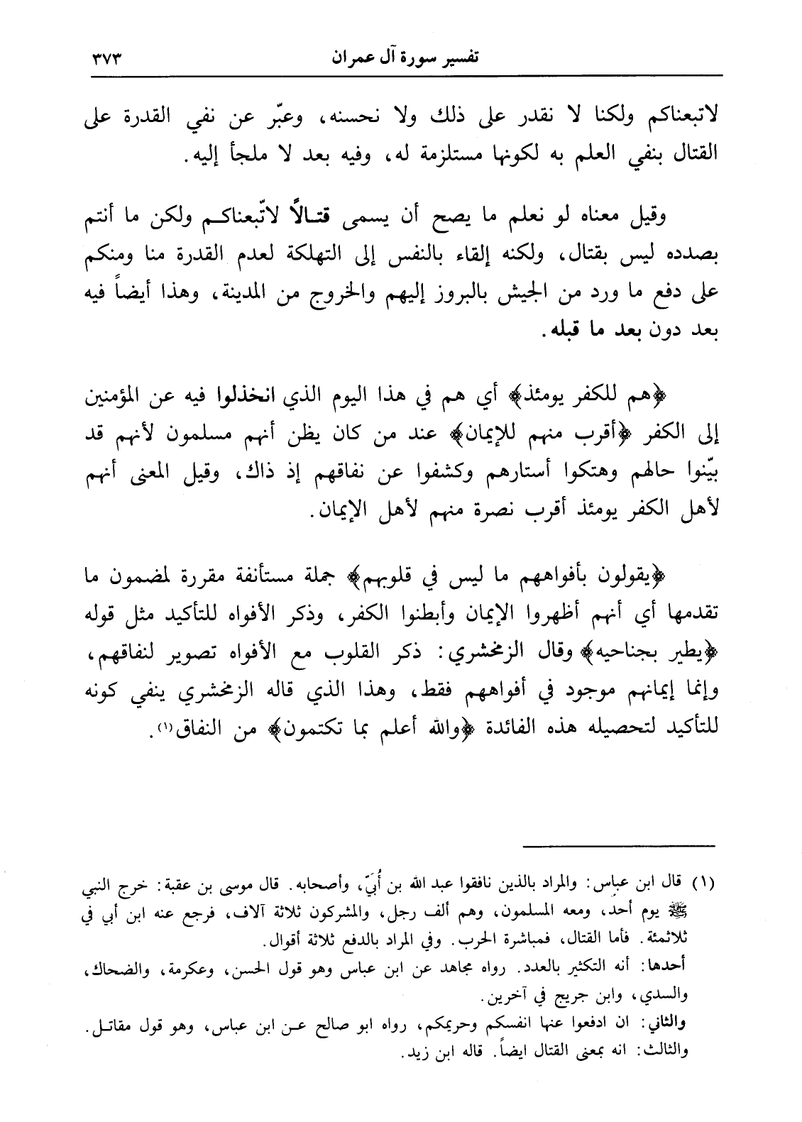 وقيل معناه لو نعلم ما يصح أن يسمى قتالاً لاتّبعناكم ولكن ما أنتم بصدده ليس بقتال، ولكنه إلقاء بالنفس إلى التهلكة لعدم القدرة منا ومنكم على دفع ما ورد من الجيش بالبروز إليهم والخروج من المدينة، وهذا أيضاً فيه بعد دون بعد ما قبله.