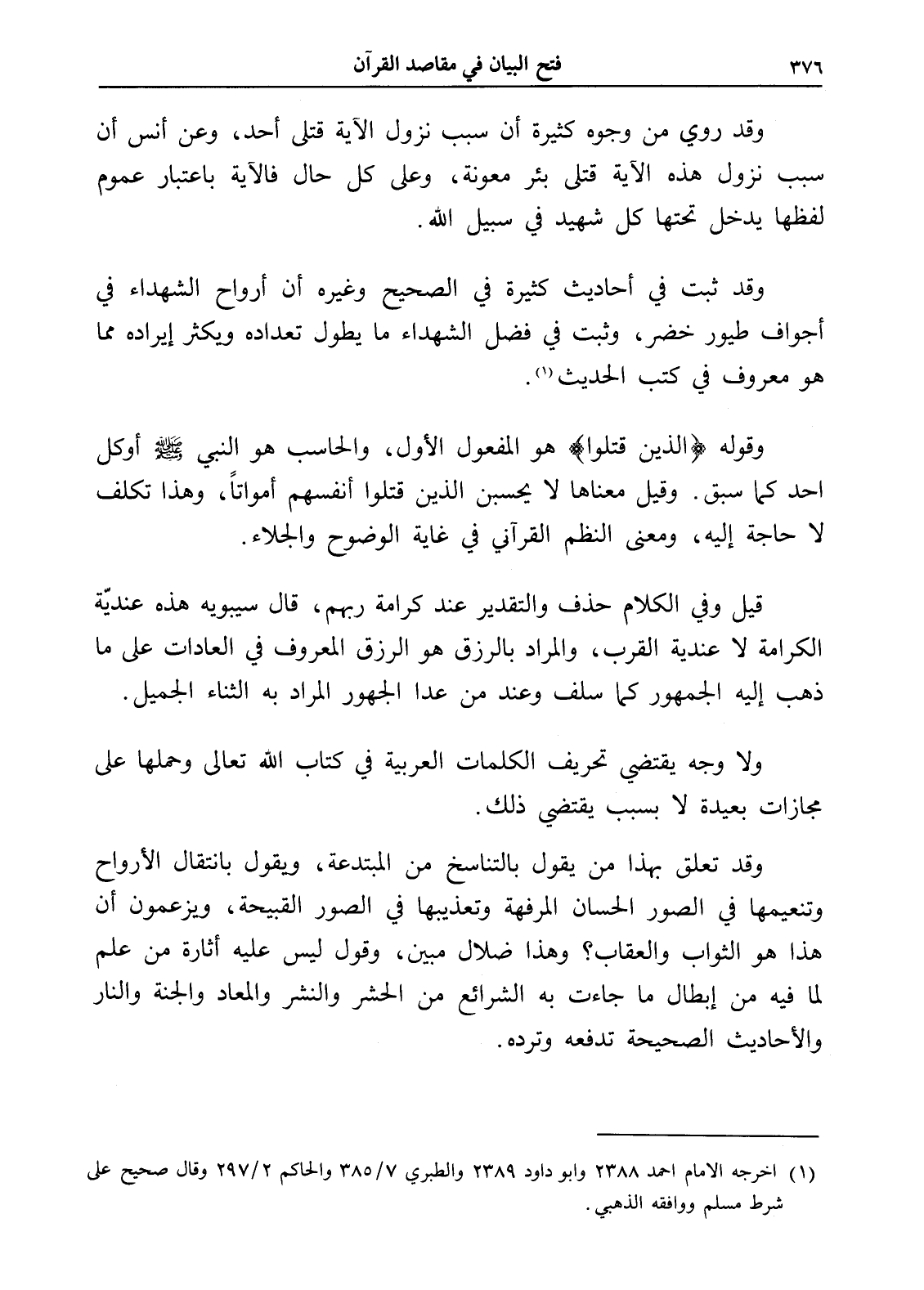 وقد ثبت في أحاديث كثيرة في الصحيح وغيره أن أرواح الشهداء في أجواف طيور خضر، وثبت في فضل الشهداء ما يطول تعداده ويكثر إيراده مما هو معروف في كتب الحديث (¬1).