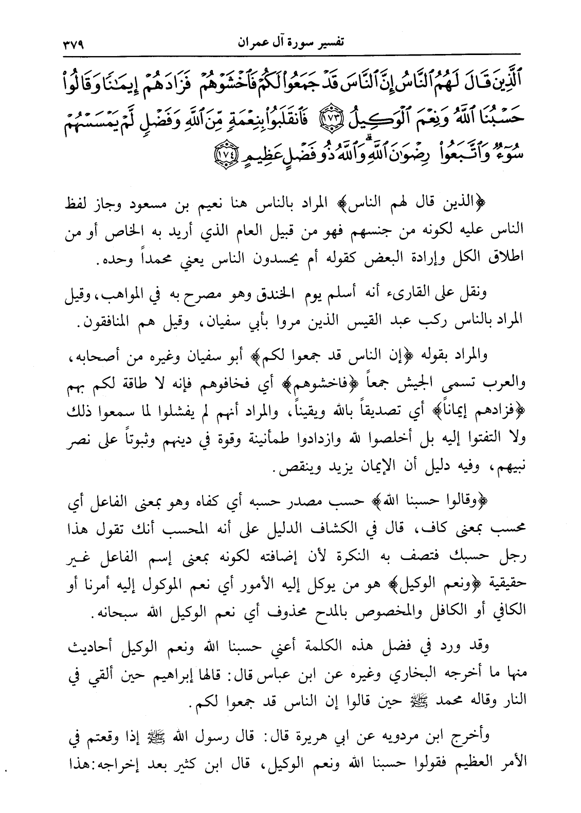 الَّذِينَ قَالَ لَهُمُ النَّاسُ إِنَّ النَّاسَ قَدْ جَمَعُوا لَكُمْ فَاخْشَوْهُمْ فَزَادَهُمْ إِيمَانًا وَقَالُوا حَسْبُنَا اللَّهُ وَنِعْمَ الْوَكِيلُ (173) فَانْقَلَبُوا بِنِعْمَةٍ مِنَ اللَّهِ وَفَضْلٍ لَمْ يَمْسَسْهُمْ سُوءٌ وَاتَّبَعُوا رِضْوَانَ اللَّهِ وَاللَّهُ ذُو فَضْلٍ عَظِيمٍ (174)