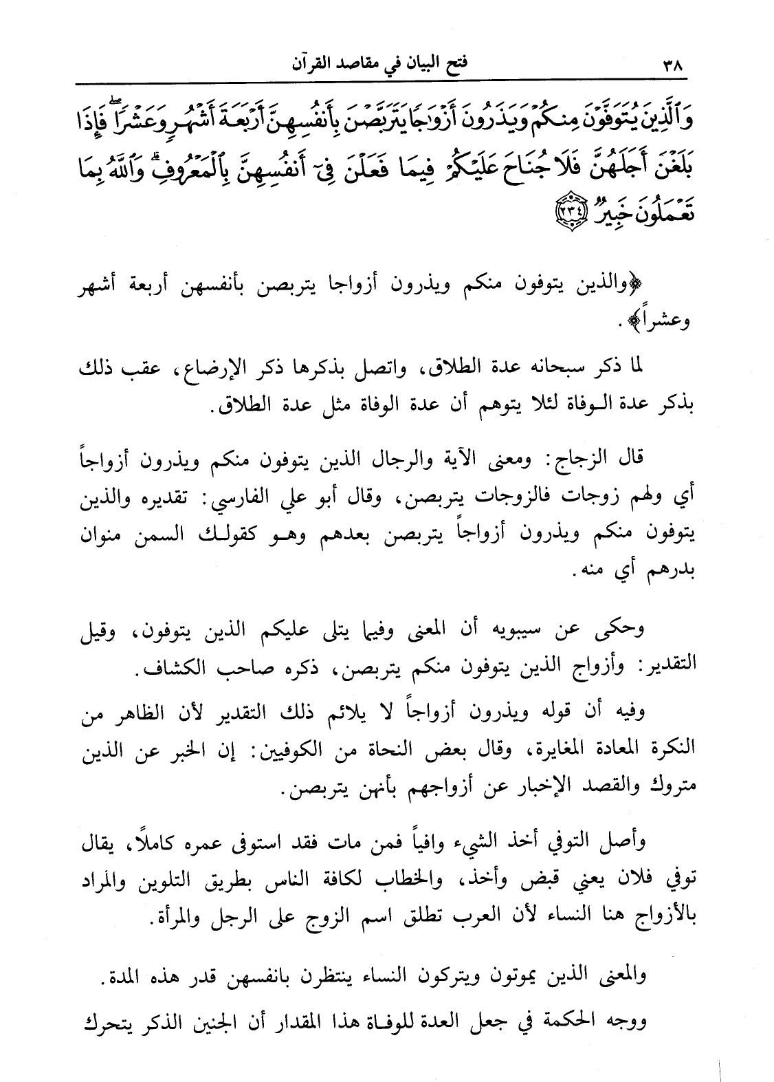 وَالَّذِينَ يُتَوَفَّوْنَ مِنْكُمْ وَيَذَرُونَ أَزْوَاجًا يَتَرَبَّصْنَ بِأَنْفُسِهِنَّ أَرْبَعَةَ أَشْهُرٍ وَعَشْرًا فَإِذَا بَلَغْنَ أَجَلَهُنَّ فَلَا جُنَاحَ عَلَيْكُمْ فِيمَا فَعَلْنَ فِي أَنْفُسِهِنَّ بِالْمَعْرُوفِ وَاللَّهُ بِمَا تَعْمَلُونَ خَبِيرٌ (234)