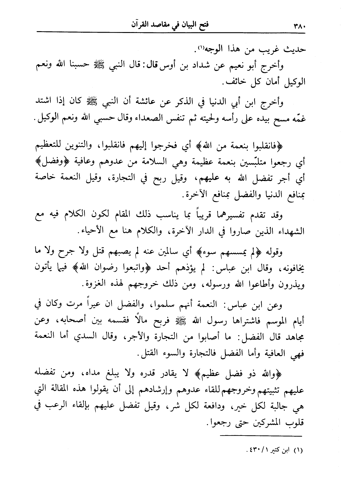 (فانقلبوا بنعمة من الله) أي فخرجوا إليهم فانقلبوا، والتنوين للتعظيم أي رجعوا متلبّسين بنعمة عظيمة وهي السلامة من عدوهم وعافية (وفضل) أي أجر تفضل الله به عليهم، وقيل ربح في التجارة، وقيل النعمة خاصة بمنافع الدنيا والفضل بمنافع الآخرة.
