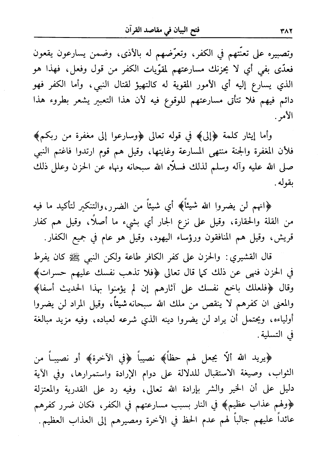 وأما إيثار كلمة (إلى) في قوله تعالى (وسارعوا إلى مغفرة من ربكم) فلأن المغفرة والجنة منتهى المسارعة وغايتها، وقيل هم قوم ارتدوا فاغتم النبي صلى الله عليه وآله وسلم لذلك فسلاّه الله سبحانه ونهاه عن الحزن وعلل ذلك بقوله.