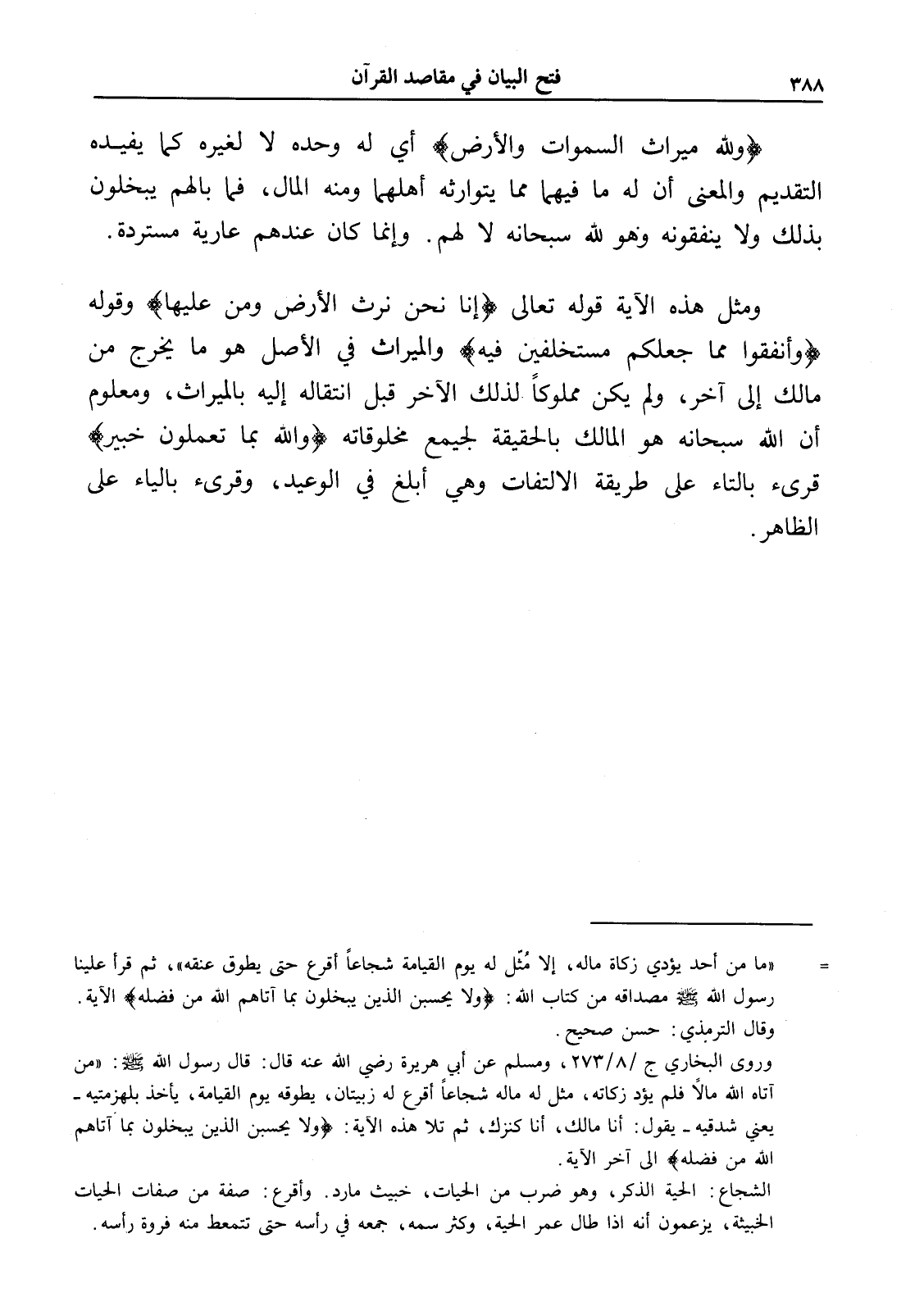 ومثل هذه الآية قوله تعالى (إنا نحن نرث الأرض ومن عليها) وقوله (وأنفقوا مما جعلكم مستخلفين فيه) والميراث في الأصل هو ما يخرج من مالك إلى آخر، ولم يكن مملوكاً. لذلك الآخر قبل انتقاله إليه بالميراث، ومعلوم أن الله سبحانه هو المالك بالحقيقة لجيمع مخلوقاته (والله بما تعملون خبير) قرىء بالتاء على طريقة الالتفات وهي أبلغ في الوعيد، وقرىء بالياء على الظاهر.