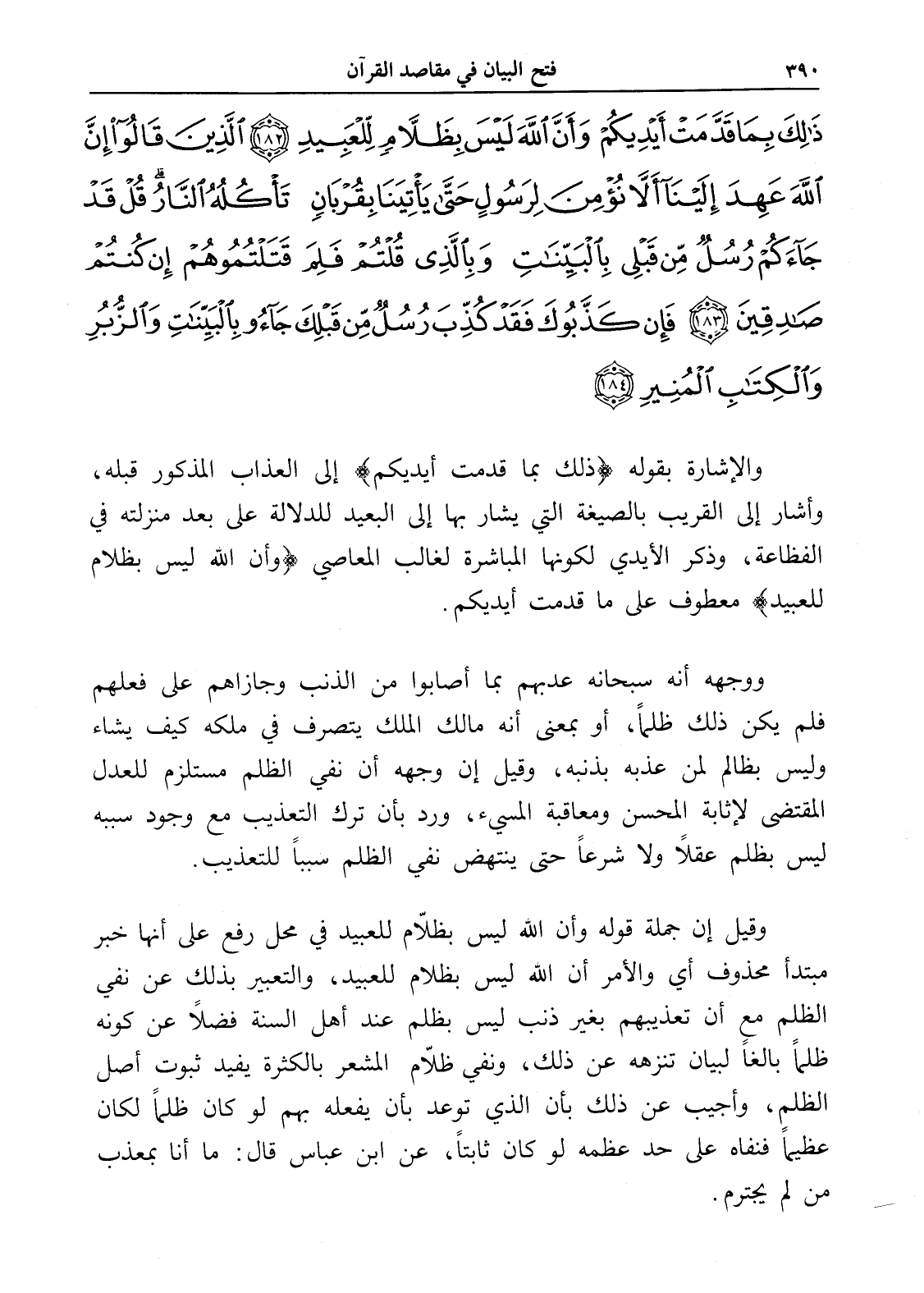ذَلِكَ بِمَا قَدَّمَتْ أَيْدِيكُمْ وَأَنَّ اللَّهَ لَيْسَ بِظَلَّامٍ لِلْعَبِيدِ (182) الَّذِينَ قَالُوا إِنَّ اللَّهَ عَهِدَ إِلَيْنَا أَلَّا نُؤْمِنَ لِرَسُولٍ حَتَّى يَأْتِيَنَا بِقُرْبَانٍ تَأْكُلُهُ النَّارُ قُلْ قَدْ جَاءَكُمْ رُسُلٌ مِنْ قَبْلِي بِالْبَيِّنَاتِ وَبِالَّذِي قُلْتُمْ فَلِمَ قَتَلْتُمُوهُمْ إِنْ كُنْتُمْ صَادِقِينَ (183) فَإِنْ كَذَّبُوكَ فَقَدْ كُذِّبَ رُسُلٌ مِنْ قَبْلِكَ جَاءُوا بِالْبَيِّنَاتِ وَالزُّبُرِ وَالْكِتَابِ الْمُنِيرِ (184)