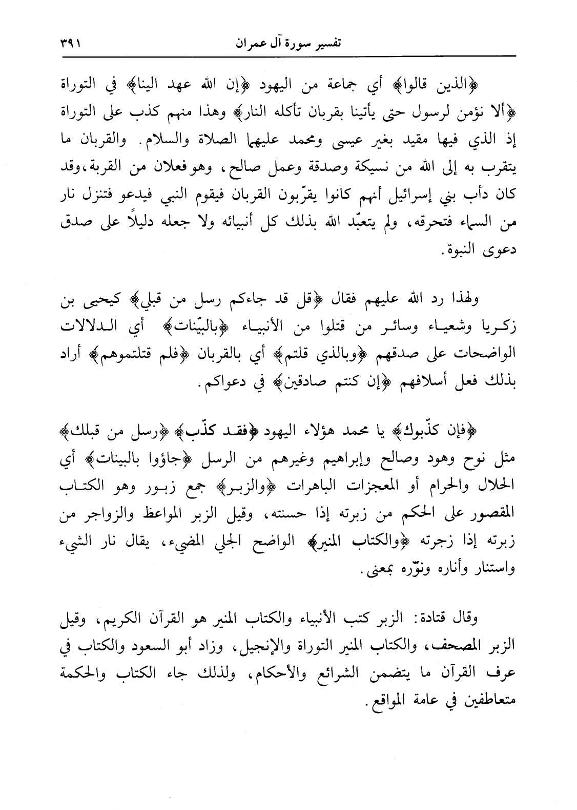 وقال قتادة: الزبر كتب الأنبياء والكتاب المنير هو القرآن الكريم، وقيل الزبر المصحف، والكتاب المنير التوراة والإنجيل، وزاد أبو السعود والكتاب في عرف القرآن ما يتضمن الشرائع والأحكام، ولذلك جاء الكتاب والحكمة متعاطفين في عامة المواقع.