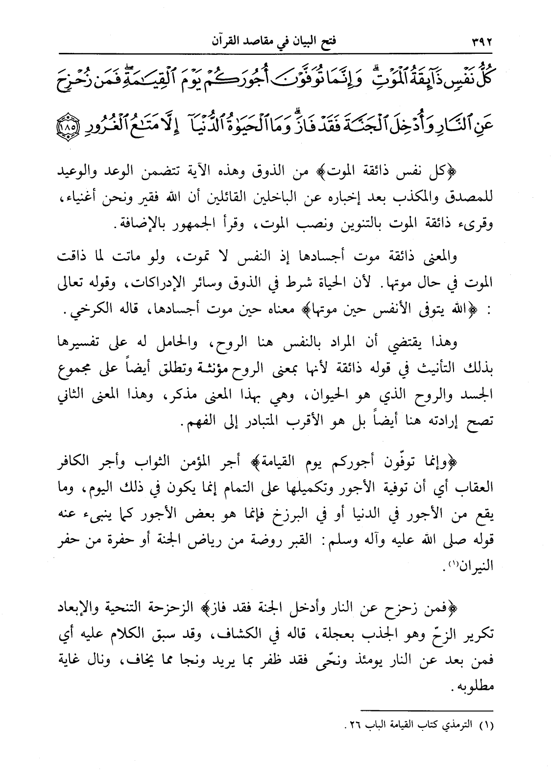 كُلُّ نَفْسٍ ذَائِقَةُ الْمَوْتِ وَإِنَّمَا تُوَفَّوْنَ أُجُورَكُمْ يَوْمَ الْقِيَامَةِ فَمَنْ زُحْزِحَ عَنِ النَّارِ وَأُدْخِلَ الْجَنَّةَ فَقَدْ فَازَ وَمَا الْحَيَاةُ الدُّنْيَا إِلَّا مَتَاعُ الْغُرُورِ (185)