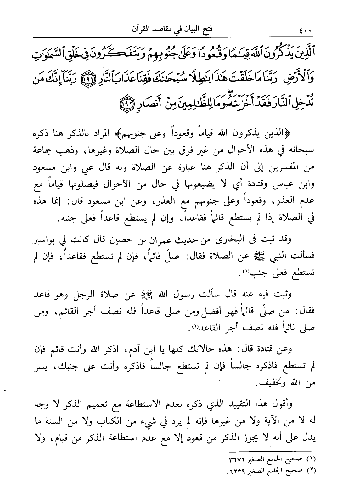 وأقول هذا التقييد الذي ذكره بعدم الاستطاعة مع تعميم الذكر لا وجه له لا من الآية ولا من غيرها فإنه لم يرد في شيء من الكتاب ولا من السنة ما يدل على أنه لا يجوز الذكر من قعود إلا مع عدم استطاعة الذكر من قيام، ولا