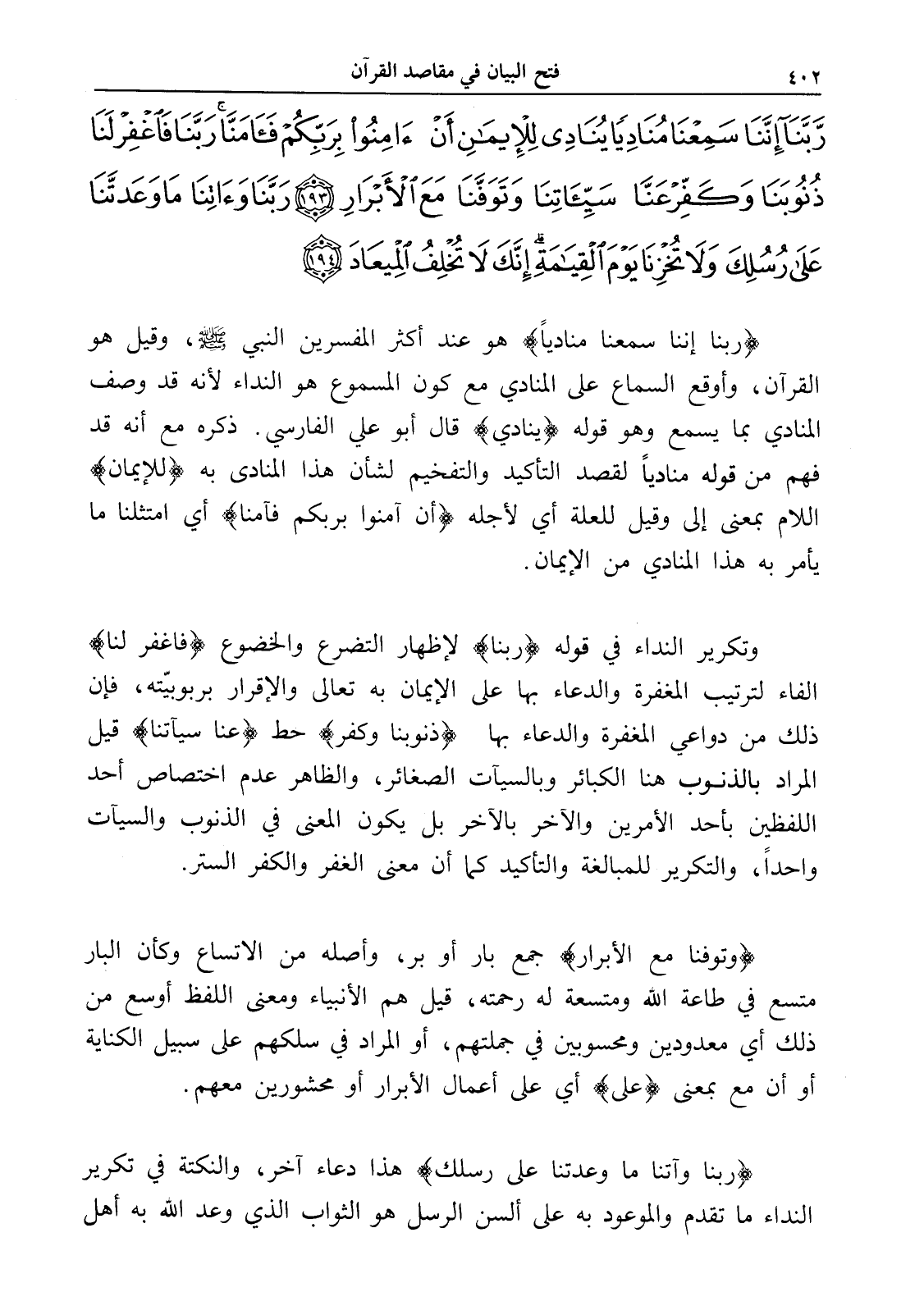 رَبَّنَا إِنَّنَا سَمِعْنَا مُنَادِيًا يُنَادِي لِلْإِيمَانِ أَنْ آَمِنُوا بِرَبِّكُمْ فَآَمَنَّا رَبَّنَا فَاغْفِرْ لَنَا ذُنُوبَنَا وَكَفِّرْ عَنَّا سَيِّئَاتِنَا وَتَوَفَّنَا مَعَ الْأَبْرَارِ (193) رَبَّنَا وَآَتِنَا مَا وَعَدْتَنَا عَلَى رُسُلِكَ وَلَا تُخْزِنَا يَوْمَ الْقِيَامَةِ إِنَّكَ لَا تُخْلِفُ الْمِيعَادَ (194)