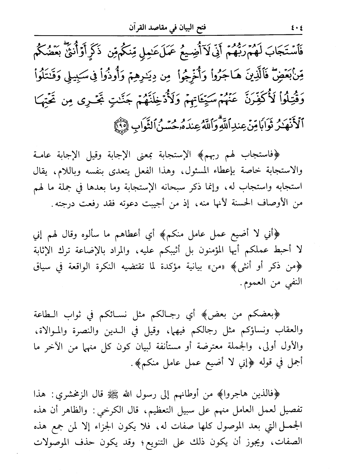 فَاسْتَجَابَ لَهُمْ رَبُّهُمْ أَنِّي لَا أُضِيعُ عَمَلَ عَامِلٍ مِنْكُمْ مِنْ ذَكَرٍ أَوْ أُنْثَى بَعْضُكُمْ مِنْ بَعْضٍ فَالَّذِينَ هَاجَرُوا وَأُخْرِجُوا مِنْ دِيَارِهِمْ وَأُوذُوا فِي سَبِيلِي وَقَاتَلُوا وَقُتِلُوا لَأُكَفِّرَنَّ عَنْهُمْ سَيِّئَاتِهِمْ وَلَأُدْخِلَنَّهُمْ جَنَّاتٍ تَجْرِي مِنْ تَحْتِهَا الْأَنْهَارُ ثَوَابًا مِنْ عِنْدِ اللَّهِ وَاللَّهُ عِنْدَهُ حُسْنُ الثَّوَابِ (195)