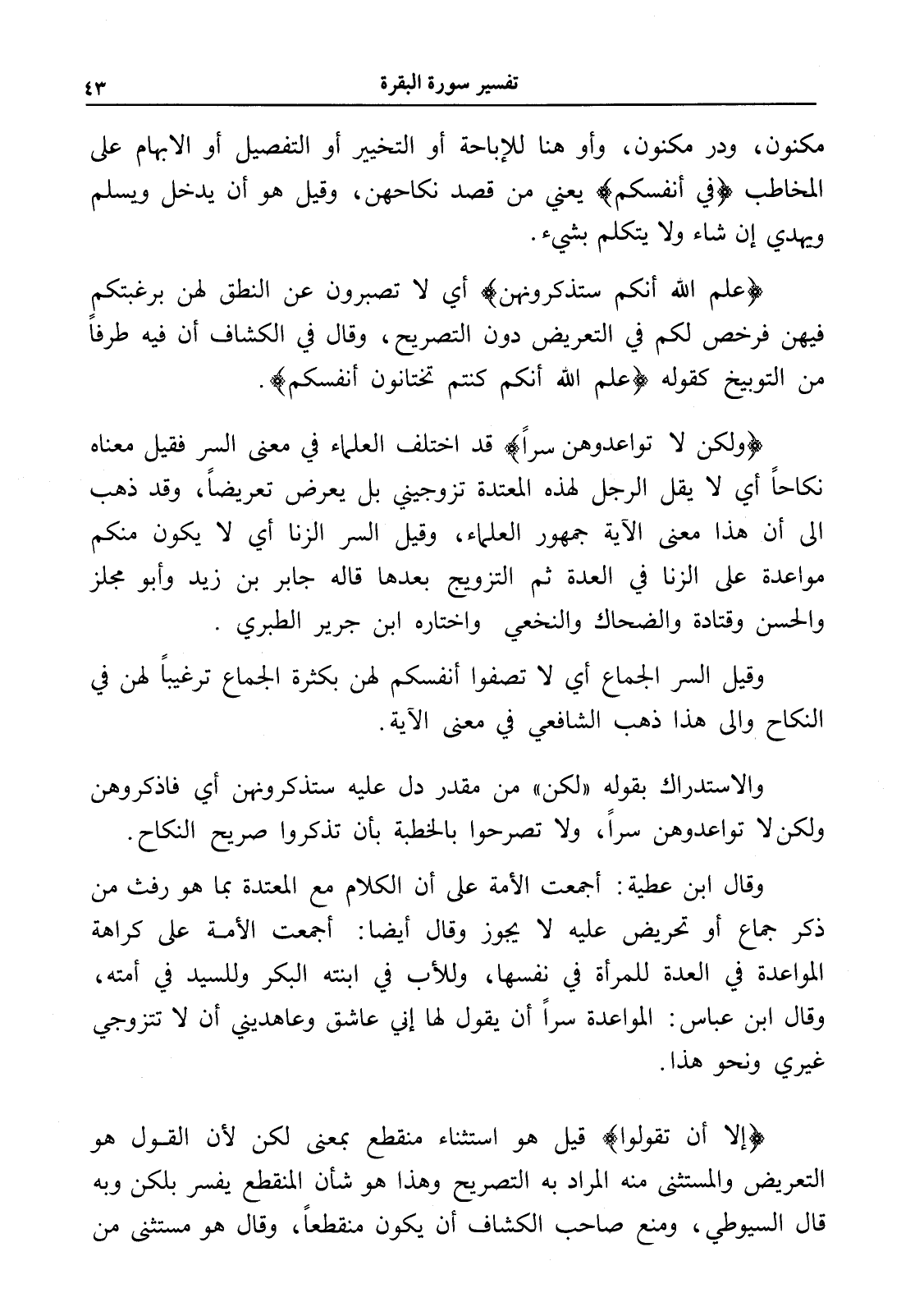 (ولكن لا تواعدوهن سراً) قد اختلف العلماء في معنى السر فقيل معناه نكاحاً أي لا يقل الرجل لهذه المعتدة تزوجيني بل يعرض تعريضاً، وقد ذهب إلى أن هذا معنى الآية جمهور العلماء، وقيل السر الزنا أي لا يكون منكم مواعدة على الزنا في العدة ثم التزويج بعدها قاله جابر بن زيد وأبو مجلز والحسن وقتادة والضحاك والنخعي واختاره ابن جرير الطبري.