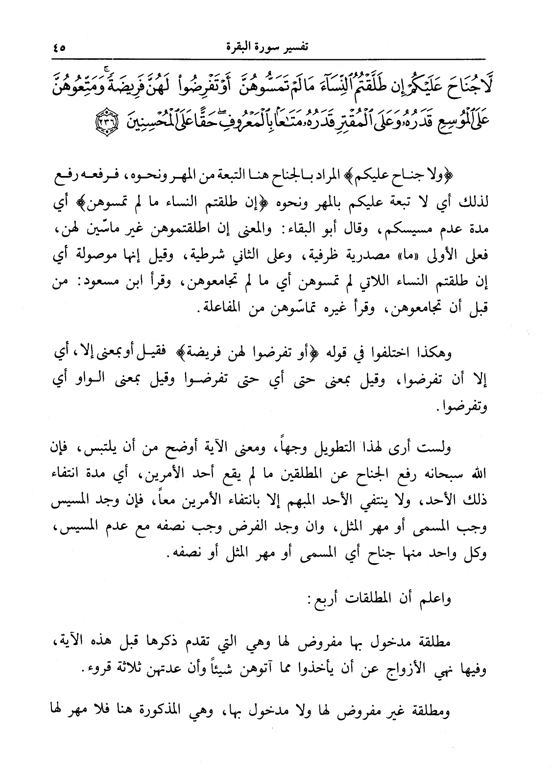 لَا جُنَاحَ عَلَيْكُمْ إِنْ طَلَّقْتُمُ النِّسَاءَ مَا لَمْ تَمَسُّوهُنَّ أَوْ تَفْرِضُوا لَهُنَّ فَرِيضَةً وَمَتِّعُوهُنَّ عَلَى الْمُوسِعِ قَدَرُهُ وَعَلَى الْمُقْتِرِ قَدَرُهُ مَتَاعًا بِالْمَعْرُوفِ حَقًّا عَلَى الْمُحْسِنِينَ (236)