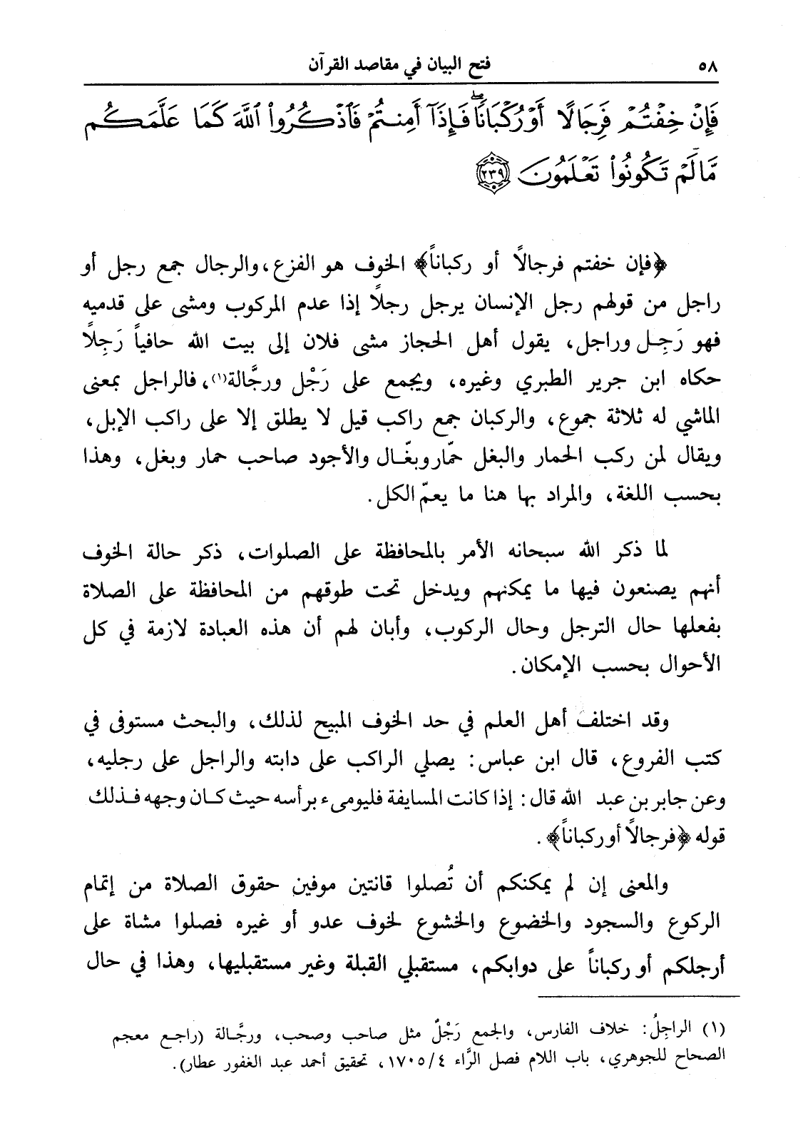 (فإن خفتم فرجالاً أو ركباناً) الخوف هو الفزع، والرجال جمع رجل أو راجل من قولهم رجل الإنسان يرجل رجلاً إذا عدم المركوب ومشى على قدميه فهو رَجِل وراجل، يقول أهل الحجاز مشى فلان إلى بيت الله حافياً رَجِلاً حكاه ابن جرير الطبري وغيره، ويجمع على رَجْل ورجَّالة (¬1)، فالراجل بمعنى الماشي له ثلاثة جموع، والركبان جمع راكب قيل لا يطلق إلا على راكب الإبل، ويقال لمن ركب الحمار والبغل حمار وبغال والأجود صاحب حمار وبغل، وهذا بحسب اللغة، والمراد بها هنا ما يعمّ الكل.
