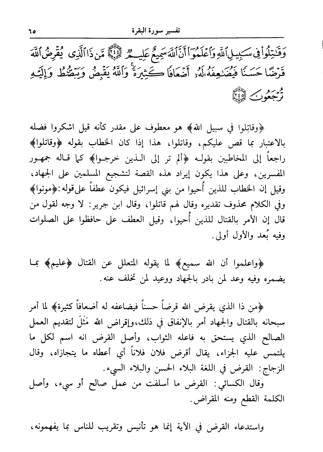 وَقَاتِلُوا فِي سَبِيلِ اللَّهِ وَاعْلَمُوا أَنَّ اللَّهَ سَمِيعٌ عَلِيمٌ (244) مَنْ ذَا الَّذِي يُقْرِضُ اللَّهَ قَرْضًا حَسَنًا فَيُضَاعِفَهُ لَهُ أَضْعَافًا كَثِيرَةً وَاللَّهُ يَقْبِضُ وَيَبْسُطُ وَإِلَيْهِ تُرْجَعُونَ (245)