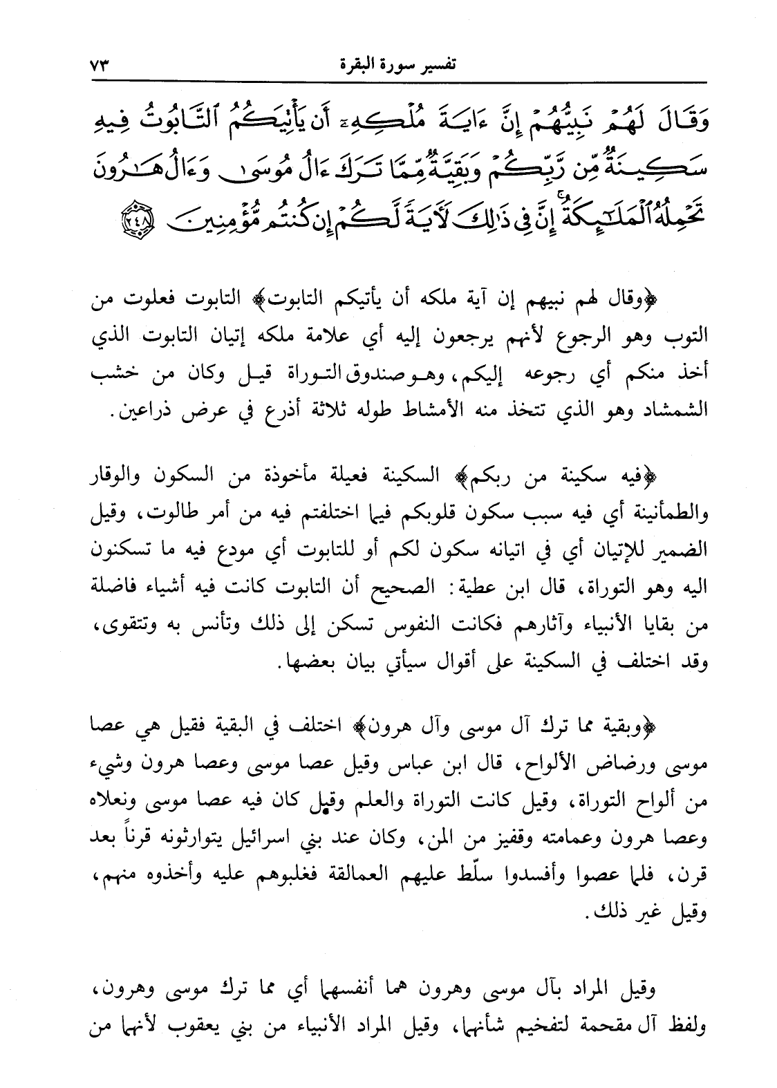 وَقَالَ لَهُمْ نَبِيُّهُمْ إِنَّ آَيَةَ مُلْكِهِ أَنْ يَأْتِيَكُمُ التَّابُوتُ فِيهِ سَكِينَةٌ مِنْ رَبِّكُمْ وَبَقِيَّةٌ مِمَّا تَرَكَ آَلُ مُوسَى وَآَلُ هَارُونَ تَحْمِلُهُ الْمَلَائِكَةُ إِنَّ فِي ذَلِكَ لَآَيَةً لَكُمْ إِنْ كُنْتُمْ مُؤْمِنِينَ (248)