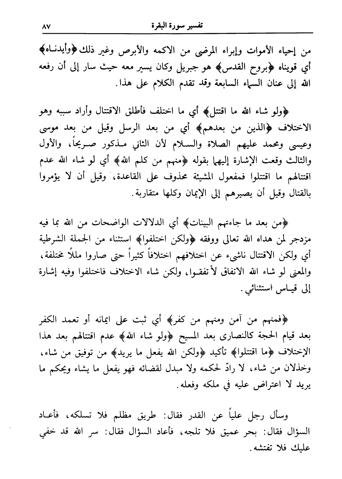 وسأل رجل علياً عن القدر فقال: طريق مظلم فلا تسلكه، فأعاد السؤال فقال: بحر عميق فلا تلجه، فأعاد السؤال فقال: سر الله قد خفي عليك فلا تفتشه.
