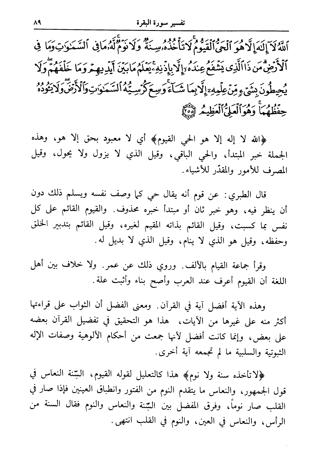 اللَّهُ لَا إِلَهَ إِلَّا هُوَ الْحَيُّ الْقَيُّومُ لَا تَأْخُذُهُ سِنَةٌ وَلَا نَوْمٌ لَهُ مَا فِي السَّمَاوَاتِ وَمَا فِي الْأَرْضِ مَنْ ذَا الَّذِي يَشْفَعُ عِنْدَهُ إِلَّا بِإِذْنِهِ يَعْلَمُ مَا بَيْنَ أَيْدِيهِمْ وَمَا خَلْفَهُمْ وَلَا يُحِيطُونَ بِشَيْءٍ مِنْ عِلْمِهِ إِلَّا بِمَا شَاءَ وَسِعَ كُرْسِيُّهُ السَّمَاوَاتِ وَالْأَرْضَ وَلَا يَئُودُهُ حِفْظُهُمَا وَهُوَ الْعَلِيُّ الْعَظِيمُ (255)