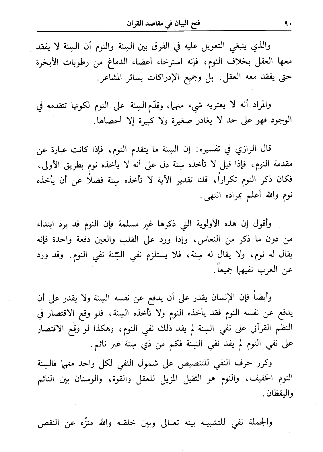 وأيضاً فإن الإنسان يقدر على أن يدفع عن نفسه السنة ولا يقدر على أن يدفع عن نفسه النوم فقد يأخذه النوم ولا تأخذه السنة، فلو وقع الاقتصار في النظم القرآني على نفي السنة لم يفد ذلك نفي النوم، وهكذا لو وقَع الاقتصار على نفي النوم لم يفد نفي السنة فكم من ذي سنة غير نائم.