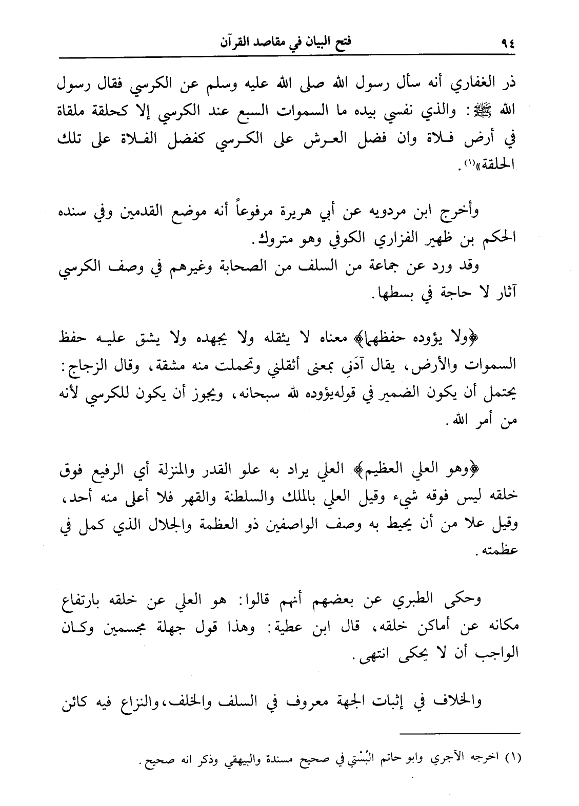 وقد ورد عن جماعة من السلف من الصحابة وغيرهم في وصف الكرسي آثار لا حاجة في بسطها.