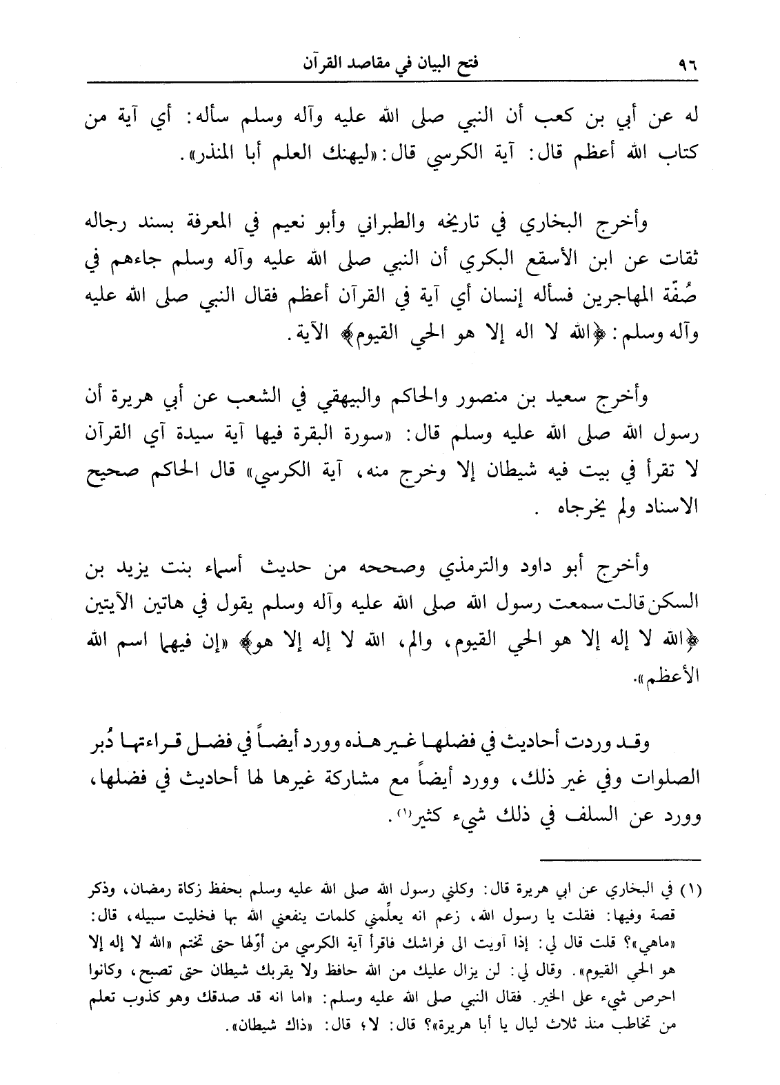 قصة وفيها: فقلت يا رسول الله، زعم أنه يعلِّمني كلمات ينفعني الله بها فخليت سبيله، قال: " ما هي "؟ قلت قال لي: إذا آويت إلى فراشك فاقرأ آية الكرسي من أولها حتى تختم " الله لا إله إلا هو الحي القيوم ". وقال لي: لن يزال عليك من الله حافظ ولا يقربك شيطان حتى تصبح، وكانوا أحرص شيء على الخير. فقال النبي صلى الله عليه وسلم: " أما إنه قد صدقك وهو كذوب تعلم من تخاطب منذ ثلاث ليال يا أبا هريرة "؟ قال: لا؛ قال: " ذاك شيطان ".