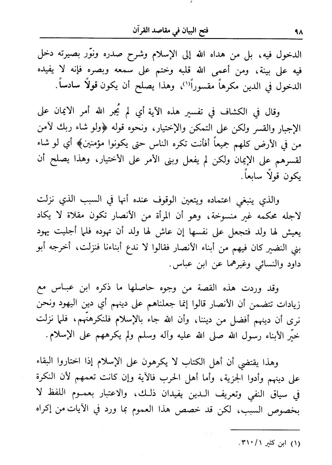 وهذا يقتضي أن أهل الكتاب لا يكرهون على الإسلام إذا اختاروا البقاء على دينهم وأدوا الجزية، وأما أهل الحرب فالآية وإن كانت تعمهم لأن النكرة في سياق النفي وتعريف الدين يفيدان ذلك، والاعتبار بعموم اللفظ لا بخصوص السبب، لكن قد خصص هذا العموم بما ورد في الآيات من إكراه