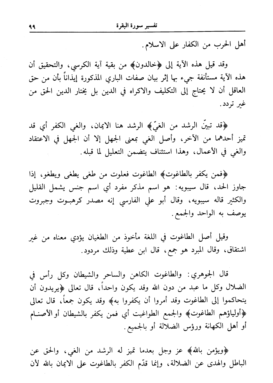 (فمن يكفر بالطاغوت) الطاغوت فعلوت من طغى يطغى ويطغو، إذا جاوز الحد، قال سيبويه: هو اسم مذكر مفرد أي اسم جنس يشمل القليل والكثير قاله سيبويه، وقال أبو علي الفارسي إنه مصدر كرهبوت وجبروت يوصف به الواحد والجمع.