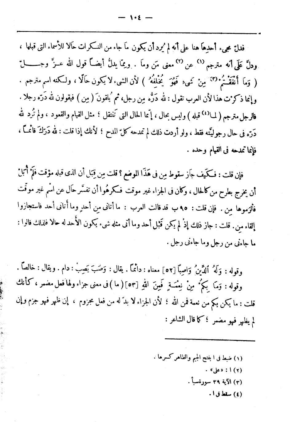 فإن قلت: فكيف جاز سقوط من فِي هَذَا الموضع؟ قلت من قبل أن الَّذِي قبله مؤقت فلم أُبَلْ أن يخرج بطرح من كالحال، وَكَانَ فِي الجزاء غير موقت فكرهُوا أن تفسَّر حال عَن اسم غير موقّت فألزموها من. فإن قلت: 95 ب قد قالت العرب: ما أتاني من أحد وما أتاني أحد فاستجازوا إلقاء من. قلت: جاز ذَلِكَ إذ لَمْ يكن قَبل أحد وما أتى مثله شىء يكون الأحد لَهُ حالًا فلذلك قالوا: