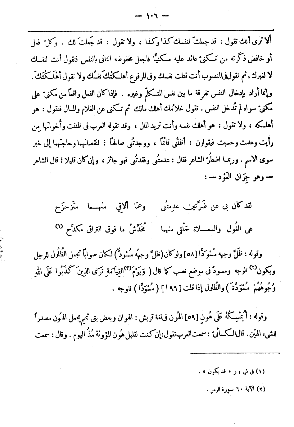 وإنَّما أراد بإدخال النفس تفرقة ما بين نفس المتكلم وغيره. فإذا كَانَ الفعل واقعًا من مكنيّ عَلَى مكنيّ سواه لَمْ تُدخل النفس. تَقُولُ غلامك أهلك مالك ثُمَّ تكني عَن الغلام والمال فتقول: هُوَ أهلكه، ولا تَقُولُ: هُوَ أهلك نفسه وأنت تريدُ المال، وقد تقوله العرب فِي ظننت وأخواتها من رأيت وعلمت وحسبت فيقولون: أظنُّني قائِمًا، ووجدتُني صالِحًا لنقصانِهما وحاجتهما إلى خبر سوى الاسم. وربما اضطر الشاعر فقال: عدمتُني وفقدتُني فهو جائز، وإن كَانَ قليلًا قَالَ الشاعر- وهو جِرَان الْعَوْد-: