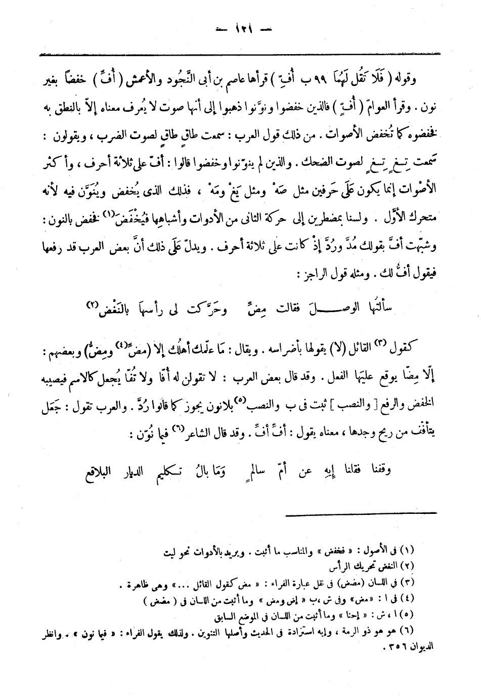 إلا مِضّا يوقع عليها الفعل. وقد قَالَ بعضُ العرب: لا تقولن له أُفا ولا تُفّا يجعل كالاسم فيصيبه الخفض والرفع [والنصب] ثبت فِي ب والنصب «5» بلا نون يَجوز كما قالوا رُدّ. والعربُ تَقُولُ: جعل يتأفف من ريح وجدها، معناهُ يقول: أفِّ أفِّ. وقد قَالَ الشاعر «6» فيما نُوّن: