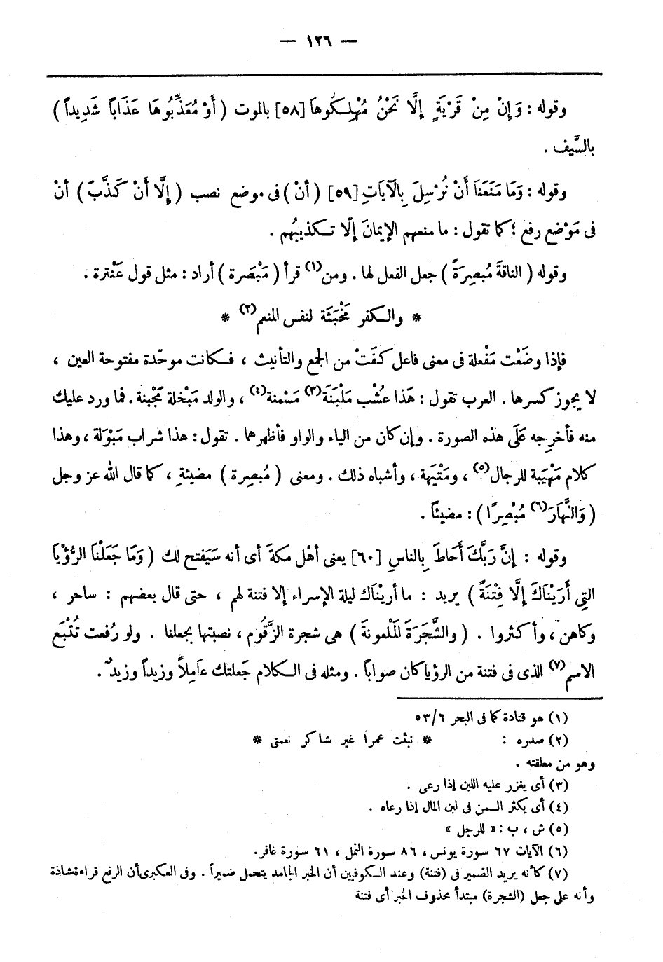 (7) كأنه يريد الضمير فى (فتنة) وعند الكوفيين أن الخبر الجامد يتحمل ضميرا. وفى العكبري أن الرفع قراءة شاذة وأنه على جعل (الشجرة) مبتدأ محذوف الخبر أي فتنة