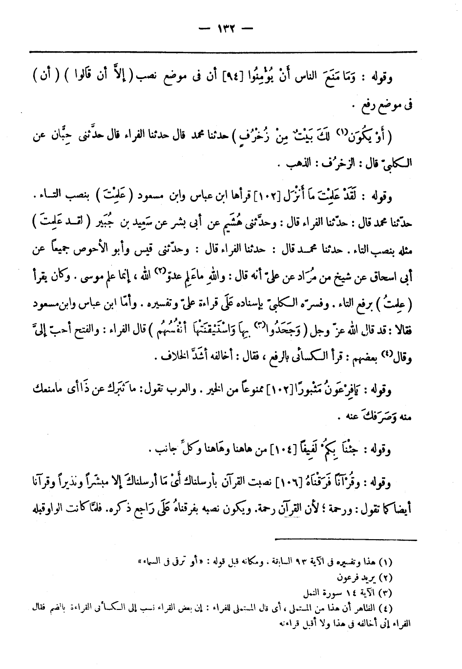 وقوله: وَقُرْآناً فَرَقْناهُ [106] نصبت القرآن بأرسلناك أي ما أرسلناك إلا مبشّرا ونذيرا وقرآنا أيضًا كما تَقُولُ: ورحمة لأن القرآن رحمة. ويكون نصبه بفرقناهُ عَلَى راجع ذكره. فلما كانت الواو قبله