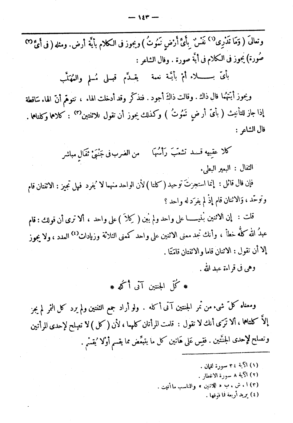 ومعناه كل شيء من ثمر الجنتين آتى أكله. ولو أراد جمع الثنتين ولم يرد كل الثمر لَمْ يجز إلا كلتاهما، ألا ترى أنك لا تَقُولُ: قامت المرأتان كلهما، لأن (كل) لا تصلح لإحدى المرأتين وتصلح لإحدى الجنتين. فقس عَلَى هاتين كل ما يتبعض مما يقسم أولا يقسم.