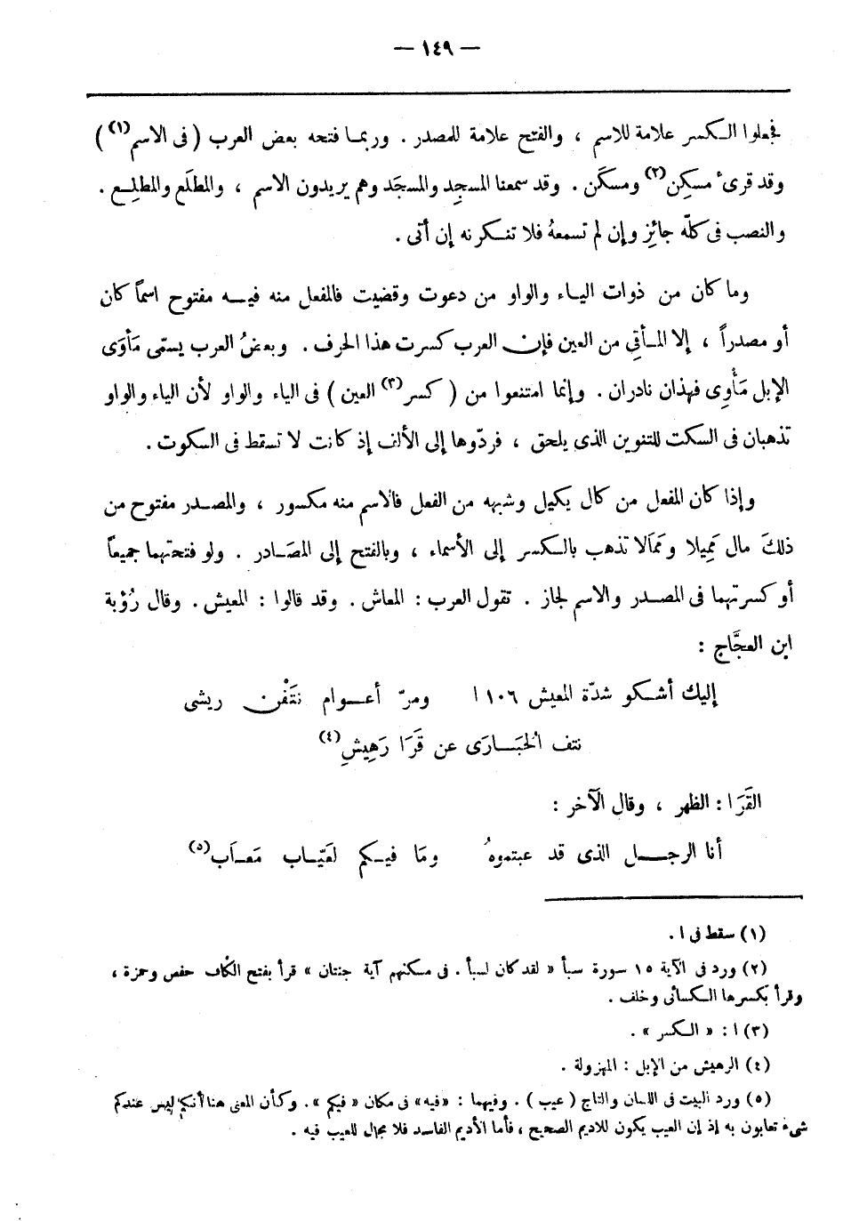وإذا كَانَ المفعل من كال يكيل وشبهه من الفعل فالاسم منه مكسور، والمصدر مفتوح من ذلك مال مميلا ومما لا تذهب بالكسر إلى الأسماء، وبالفتح إلى المصادر. ولو فتحتهما جَميعًا أو كسرتهما فِي المصدر والاسم لَجاز. تَقُولُ العرب: المعاش. وقد قالوا: المعيش. وقال رؤبة ابن العجّاج: